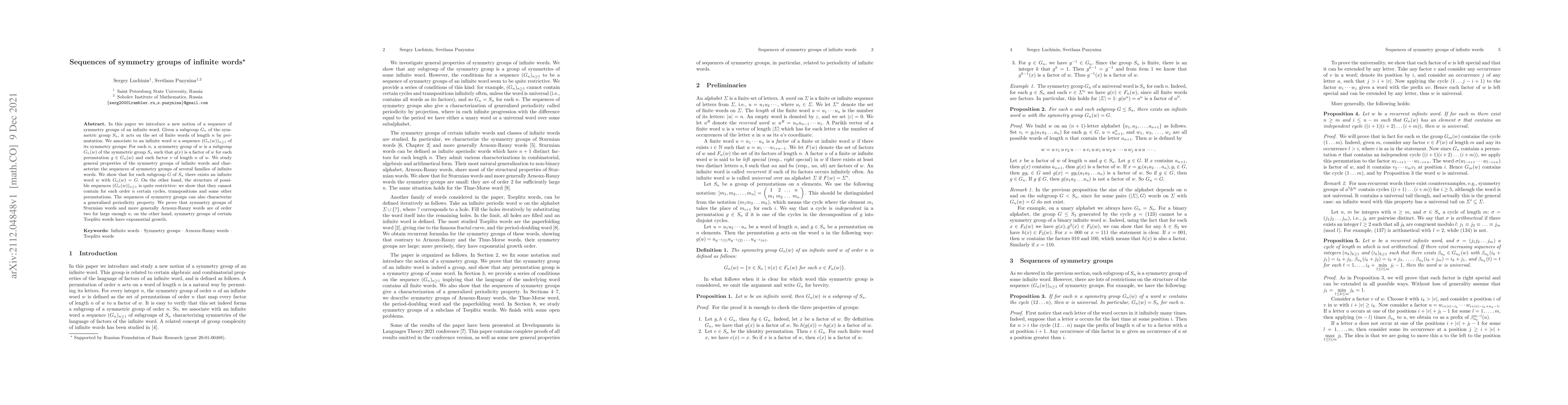 In this paper we introduce a new notion of a sequence of symmetry groups of an infinite word. Given a subgroup $G_n$ of the symmetric group $S_n$, it acts on the set of finite words of length $n$ by permutation. We associate to an infinite word $w$ a sequence $(G_n(w))_{n\geq 1}$ of its symmetry groups: For each $n$, a symmetry group of $w$ is a subgroup $G_n(w)$ of the symmetric group $S_n$ such that $g(v)$ is a factor of $w$ for each permutation $g \in G_n(w)$ and each factor $v$ of length $n$ of $w$. We study general properties of the symmetry groups of infinite words and characterize the sequences of symmetry groups of several families of infinite words. We show that for each subgroup $G$ of $S_n$ there exists an infinite word $w$ with $G_n(w)=G$. On the other hand, the structure of possible sequences $(G_n(w))_{n\geq 1}$ is quite restrictive: we show that they cannot contain for each order $n$ certain cycles, transpositions and some other permutations. The sequences of symmetry groups can also characterize a generalized periodicity property. We prove that symmetry groups of Sturmian words and more generally Arnoux-Rauzy words are of order two for large enough $n$; on the other hand, symmetry groups of certain Toeplitz words have exponential growth.