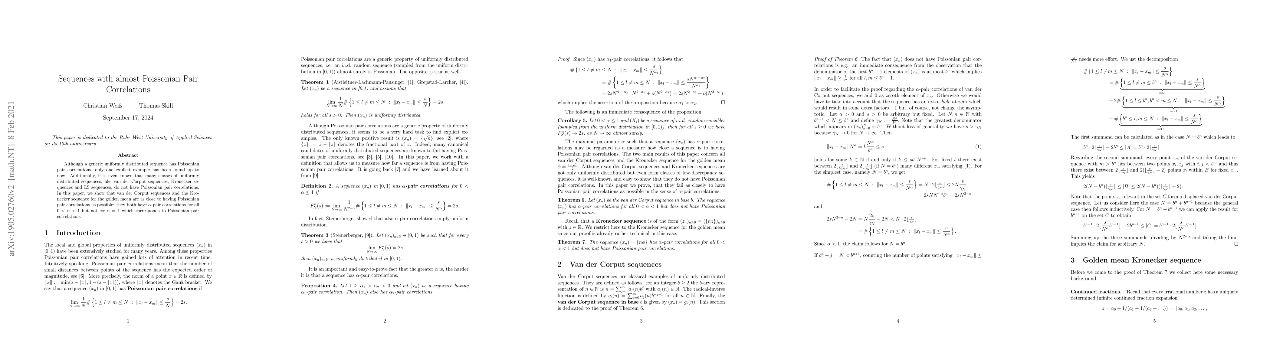 This paper demonstrates that van der Corput sequences and the Kronecker sequence for the golden mean exhibit near-Poissonian pair correlations, having $\alpha$-pair correlations for $0 < \alpha < 1$, but fail to meet the exact Poissonian condition for $\alpha = 1$.