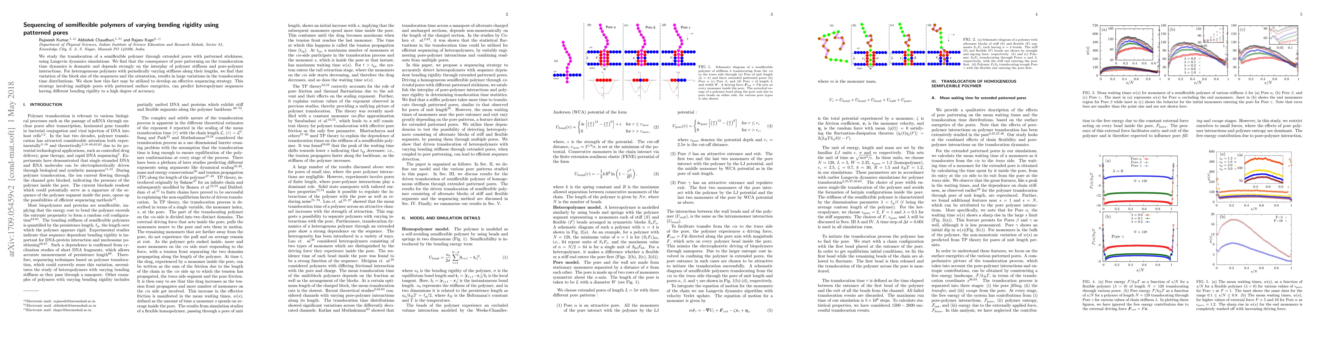The paper presents a computational method for sequencing heteropolymers using patterned nanostructures, leveraging the strong dependence of translocation dynamics on polymer stiffness and pore-polymer interactions.