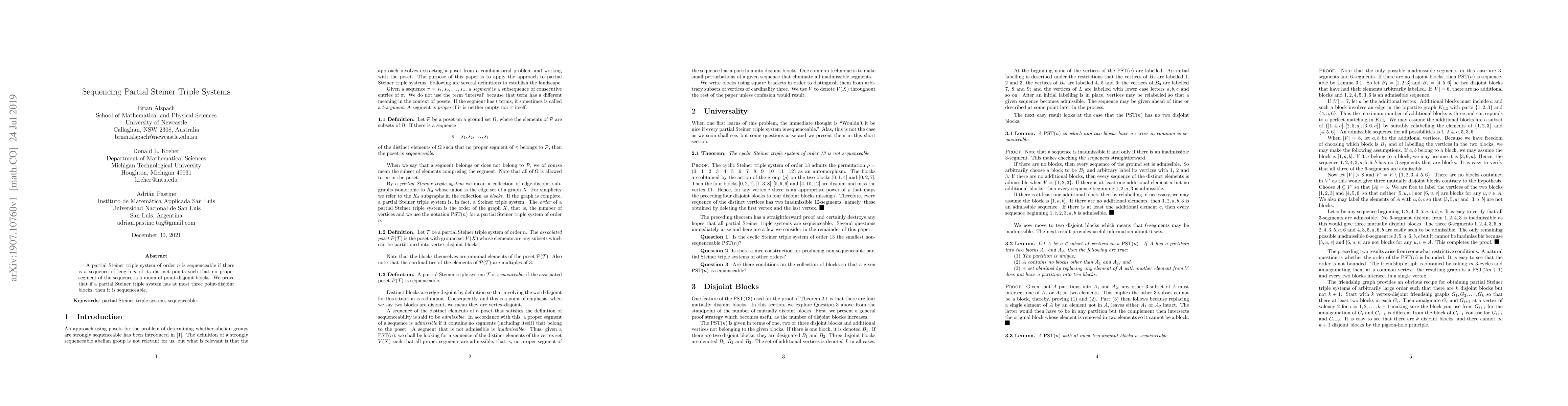 Summary: This paper proves that partial Steiner triple systems with at most three point-disjoint blocks are sequenceable, meaning they can be arranged in a sequence where no proper segment forms a union of these blocks. The result establishes a condition for sequenceability in such systems.