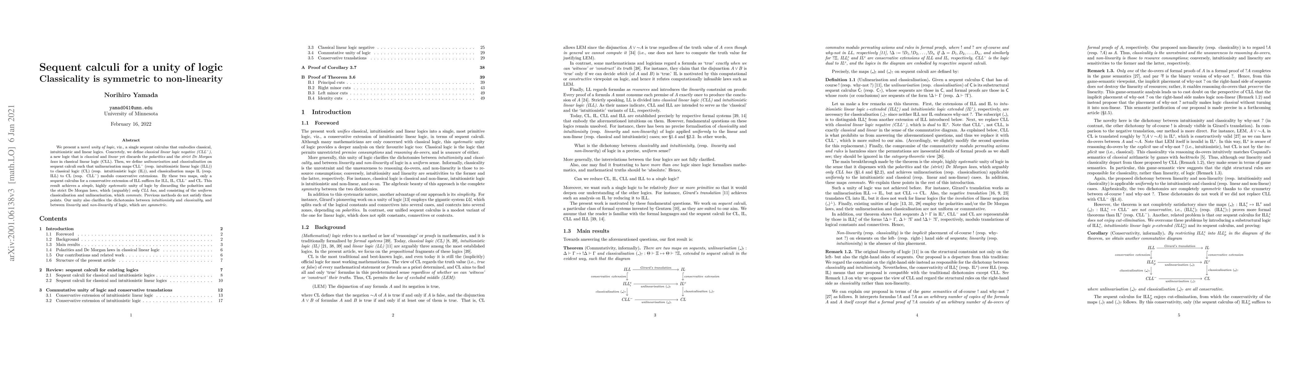We present a novel unity of logic, viz., a single sequent calculus that embodies classical, intuitionistic and linear logics. Concretely, we define classical linear logic negative (CLL$^-$), a new logic that is classical and linear yet discards the polarities and the strict De Morgan laws in classical linear logic (CLL). Then, we define unlinearisation and classicalisation on sequent calculi such that unlinearisation maps CLL$^-$ (resp. intuitionistic linear logic (ILL)) to classical logic (CL) (resp. intuitionistic logic (IL)), and classicalisation maps IL (resp. ILL) to CL (resp. CLL$^-$) modulo conservative extensions. By these two maps, only a sequent calculus for a conservative extension of ILL suffices for ILL, IL, CLL$^-$ and CL. This result achieves a simple, highly systematic unity of logic by discarding the polarities and the strict De Morgan laws, which (arguably) only CLL has, and consisting of the uniform classicalisation and unlinearisation, which commute. Previous methods do not satisfy these points. Our unity also clarifies the dichotomies between intuitionisity and classicality, and between linearity and non-linearity of logic, which are symmetric.