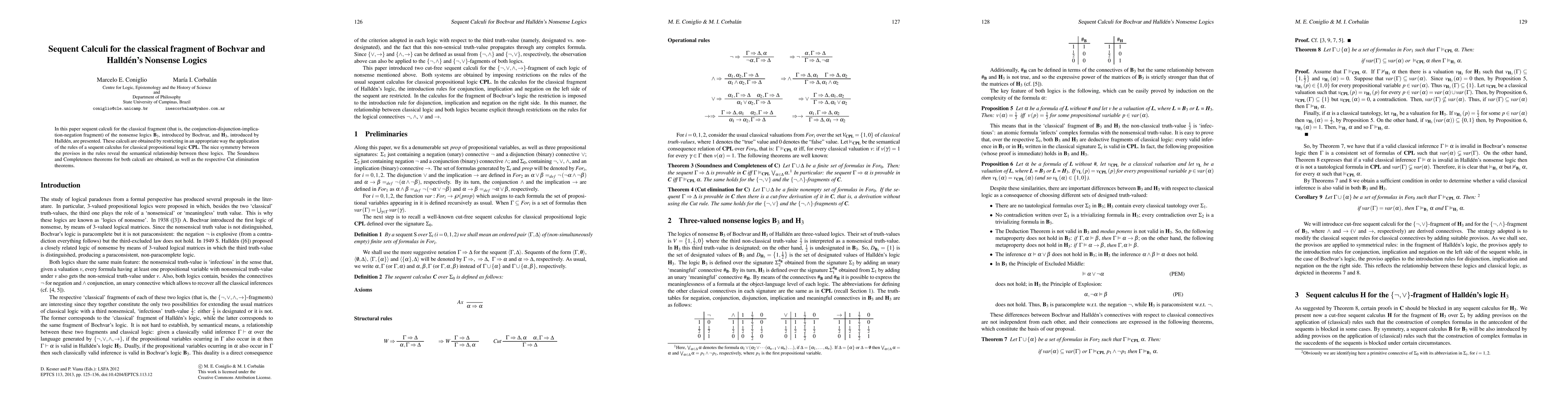 This paper presents sequent calculi for the classical fragment of Bochvar's B3 and Halldén's H3 nonsense logics, derived by suitably restricting classical propositional logic rules. It establishes soundness, completeness, and cut elimination theorems for these calculi, highlighting the semantical symmetry between the logics.