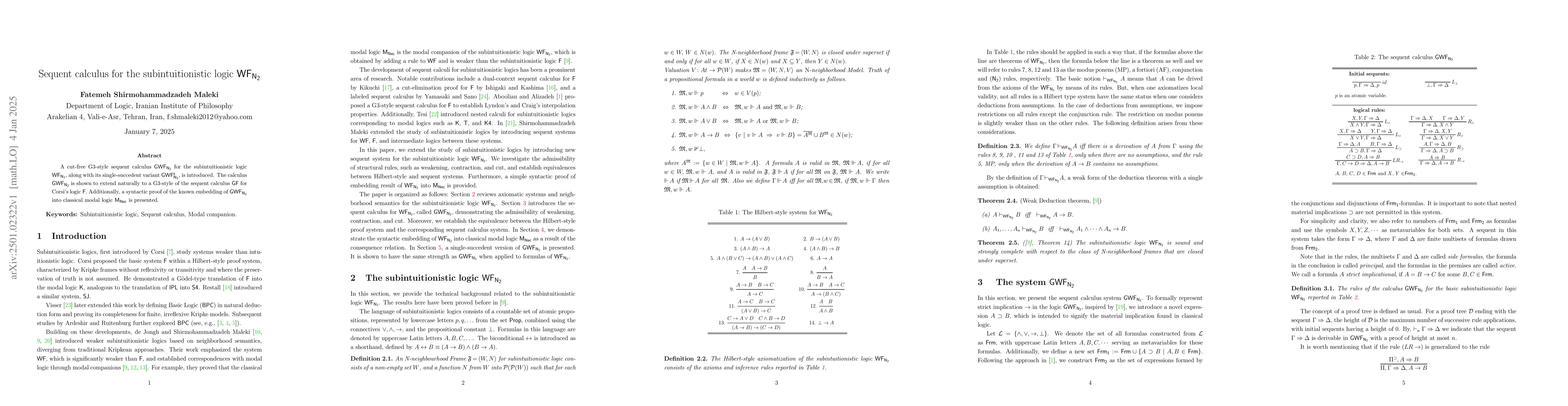 This paper introduces a cut-free sequent calculus GWFN2 for the subintuitionistic logic WFN2, extending it to GF for Corsis logic F, and provides a syntactic proof of its embedding into classical modal logic MNec.