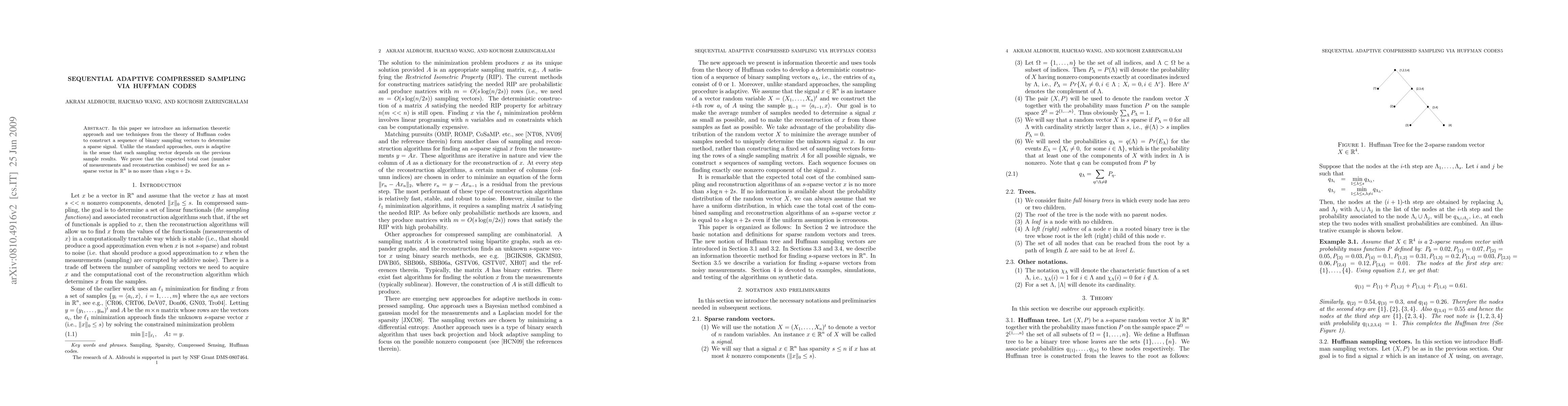 There are two main approaches in compressed sensing: the geometric approach and the combinatorial approach. In this paper we introduce an information theoretic approach and use results from the theory of Huffman codes to construct a sequence of binary sampling vectors to determine a sparse signal. Unlike other approaches, our approach is adaptive in the sense that each sampling vector depends on the previous sample. The number of measurements we need for a k-sparse vector in n-dimensional space is no more than O(k log n) and the reconstruction is O(k).