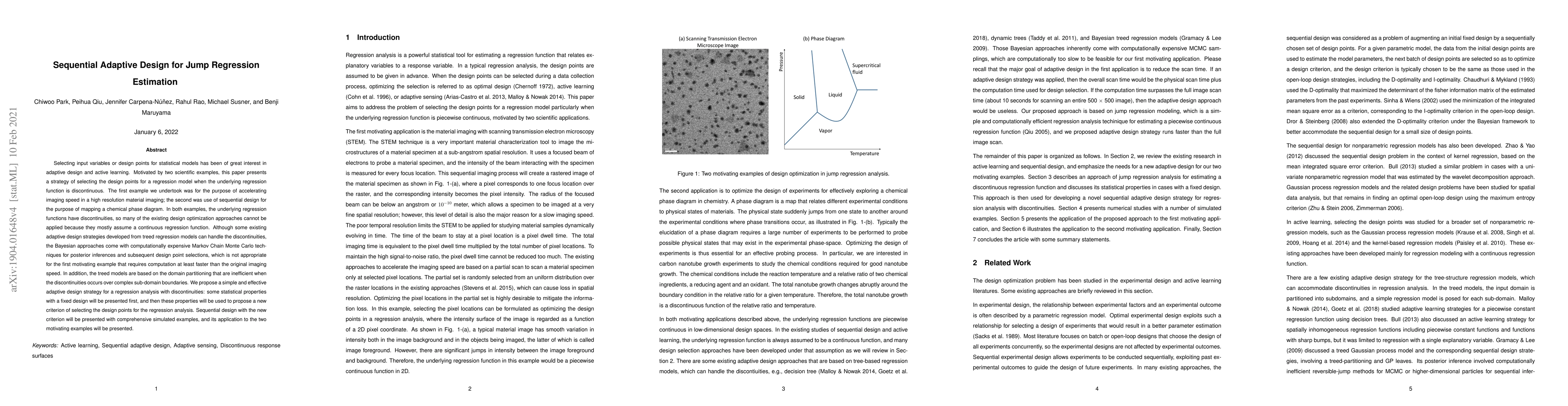 This paper proposes an adaptive design strategy for selecting design points in regression models with discontinuous underlying functions, addressing the limitations of existing methods. It introduces a new criterion for sequential design, demonstrated through simulated examples and applications in high-resolution material imaging and chemical phase diagram mapping.