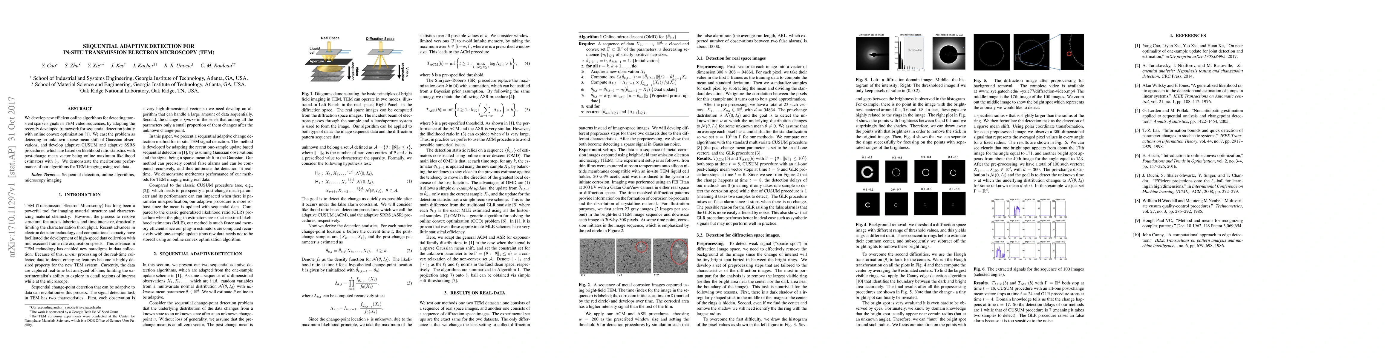 We develop new efficient online algorithms for detecting transient sparse signals in TEM video sequences, by adopting the recently developed framework for sequential detection jointly with online convex optimization [1]. We cast the problem as detecting an unknown sparse mean shift of Gaussian observations, and develop adaptive CUSUM and adaptive SSRS procedures, which are based on likelihood ratio statistics with post-change mean vector being online maximum likelihood estimators with $\ell_1$. We demonstrate the meritorious performance of our algorithms for TEM imaging using real data.