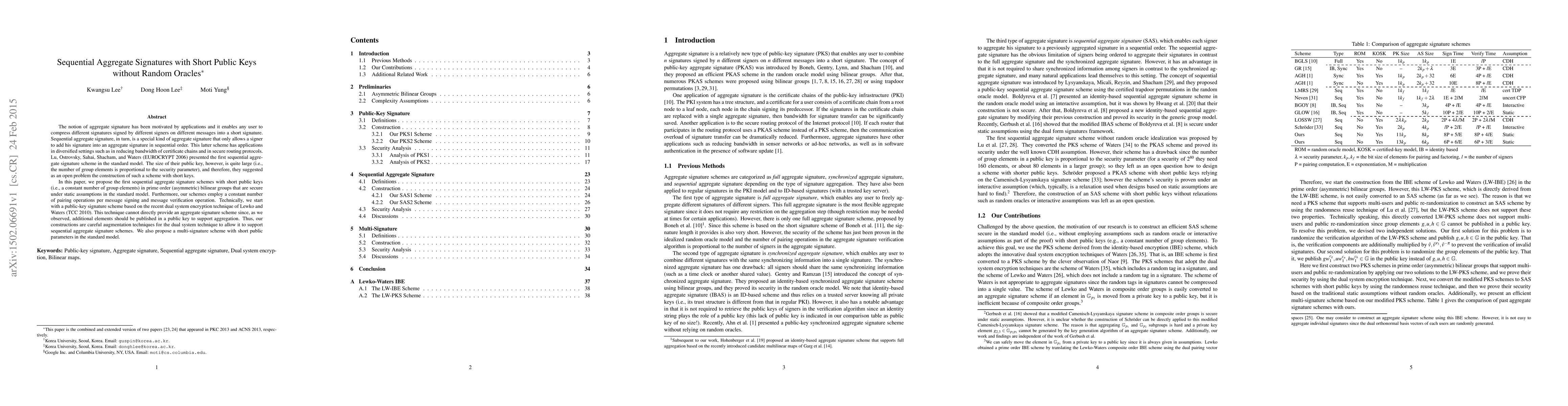 This paper introduces the first sequential aggregate signature schemes with short public keys in prime order bilinear groups, addressing the open problem of reducing the size of public keys. The proposed schemes are secure under static assumptions and require a constant number of pairing operations per signing and verification.