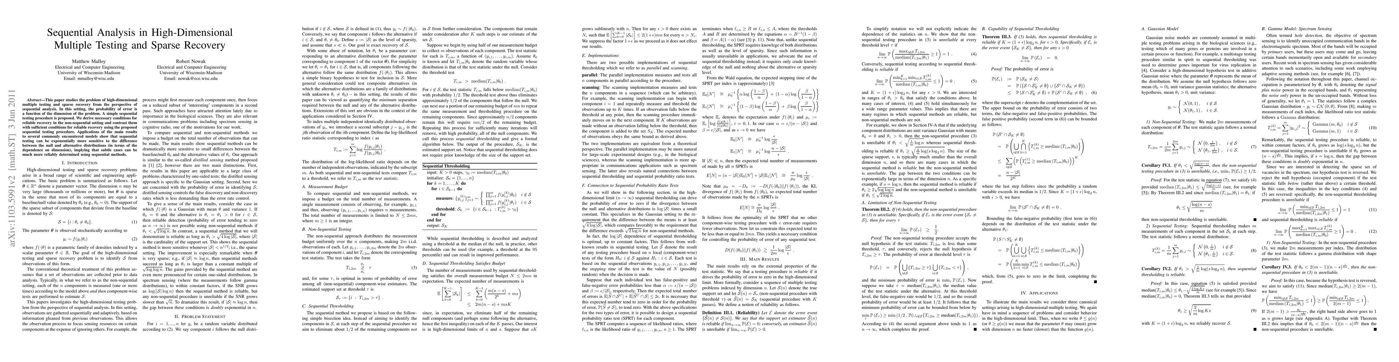 This paper studies the problem of high-dimensional multiple testing and sparse recovery from the perspective of sequential analysis. In this setting, the probability of error is a function of the dimension of the problem. A simple sequential testing procedure is proposed. We derive necessary conditions for reliable recovery in the non-sequential setting and contrast them with sufficient conditions for reliable recovery using the proposed sequential testing procedure. Applications of the main results to several commonly encountered models show that sequential testing can be exponentially more sensitive to the difference between the null and alternative distributions (in terms of the dependence on dimension), implying that subtle cases can be much more reliably determined using sequential methods.