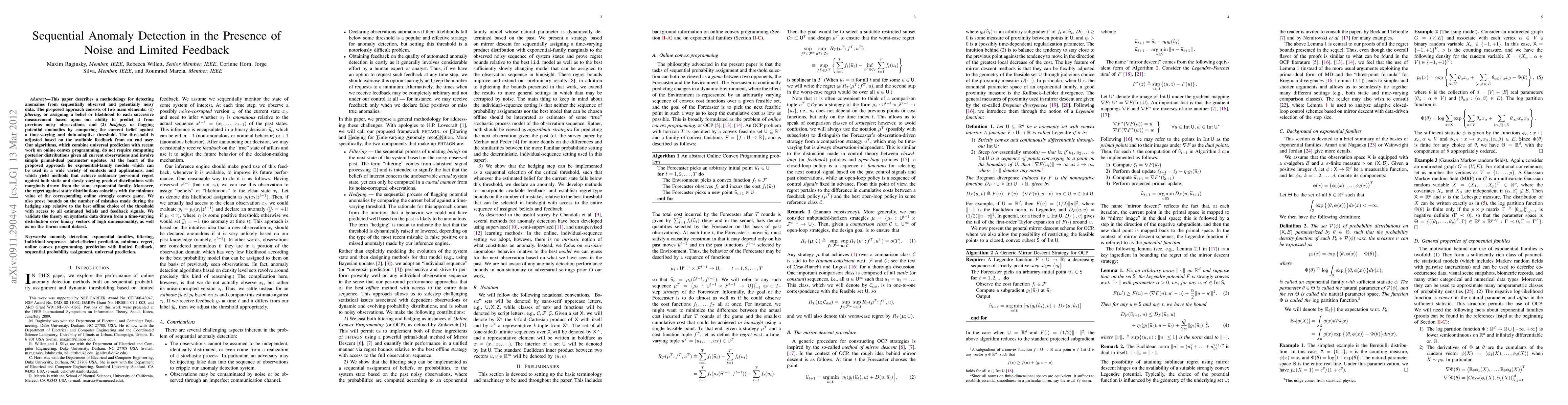 This paper describes a methodology for detecting anomalies from sequentially observed and potentially noisy data. The proposed approach consists of two main elements: (1) {\em filtering}, or assigning a belief or likelihood to each successive measurement based upon our ability to predict it from previous noisy observations, and (2) {\em hedging}, or flagging potential anomalies by comparing the current belief against a time-varying and data-adaptive threshold. The threshold is adjusted based on the available feedback from an end user. Our algorithms, which combine universal prediction with recent work on online convex programming, do not require computing posterior distributions given all current observations and involve simple primal-dual parameter updates. At the heart of the proposed approach lie exponential-family models which can be used in a wide variety of contexts and applications, and which yield methods that achieve sublinear per-round regret against both static and slowly varying product distributions with marginals drawn from the same exponential family. Moreover, the regret against static distributions coincides with the minimax value of the corresponding online strongly convex game. We also prove bounds on the number of mistakes made during the hedging step relative to the best offline choice of the threshold with access to all estimated beliefs and feedback signals. We validate the theory on synthetic data drawn from a time-varying distribution over binary vectors of high dimensionality, as well as on the Enron email dataset.