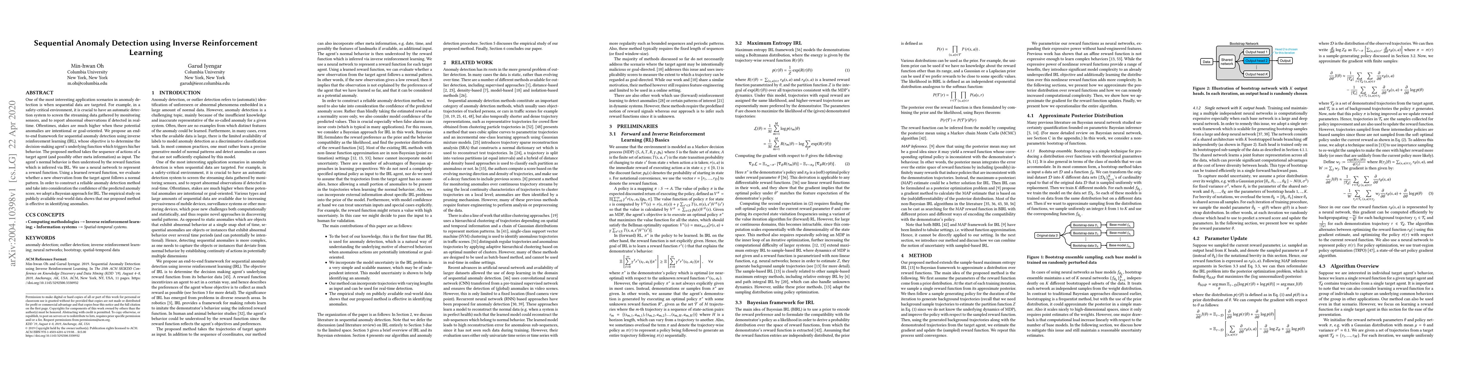 The paper proposes an end-to-end framework for sequential anomaly detection using inverse reinforcement learning (IRL). It infers a reward function representing normal behavior from a target agent's sequence of actions, using a Bayesian approach for IRL to incorporate confidence in anomaly scores. Neural networks are employed to represent the reward function and policy.