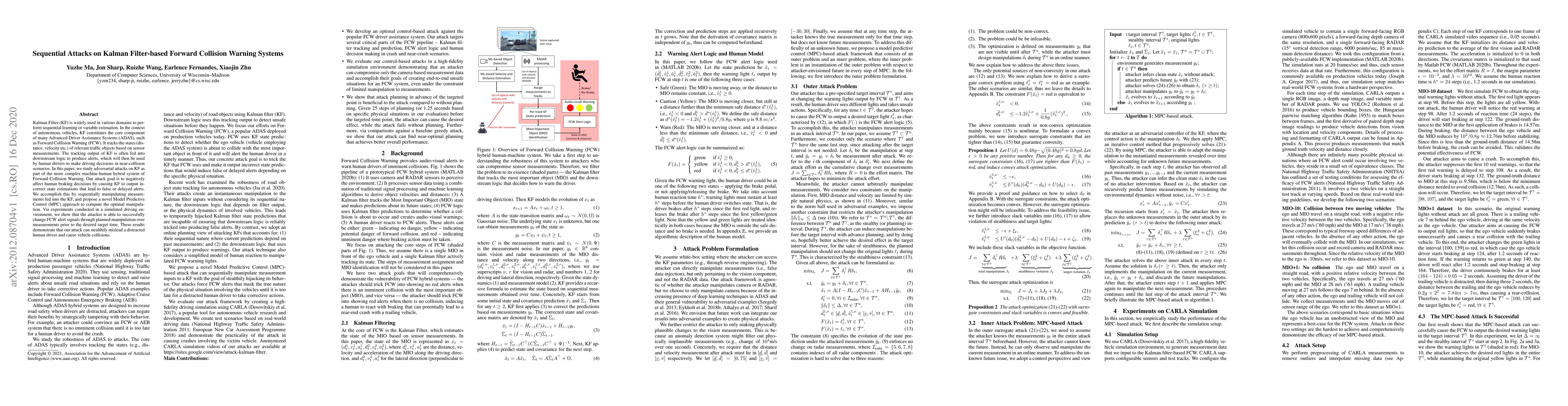 This paper explores adversarial attacks on Kalman Filter-based Forward Collision Warning systems, aiming to manipulate sensor measurements to produce false or delayed alerts. The authors propose a novel Model Predictive Control approach to compute optimal manipulations, demonstrating through simulations that their attack can mislead drivers and potentially cause collisions.