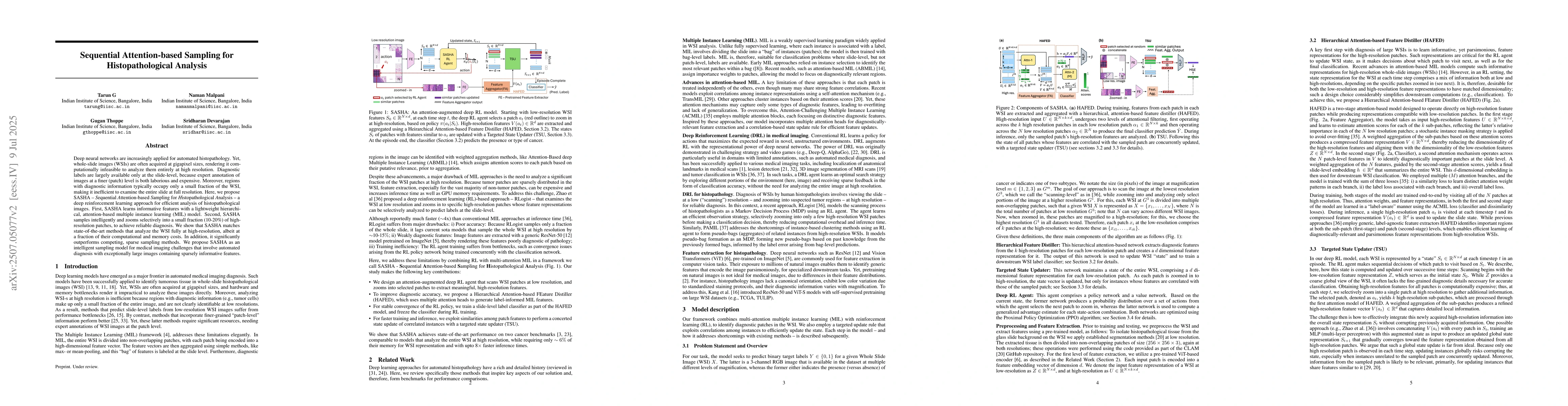Deep neural networks are increasingly applied for automated histopathology. Yet, whole-slide images (WSIs) are often acquired at gigapixel sizes, rendering it computationally infeasible to analyze them entirely at high resolution. Diagnostic labels are largely available only at the slide-level, because expert annotation of images at a finer (patch) level is both laborious and expensive. Moreover, regions with diagnostic information typically occupy only a small fraction of the WSI, making it inefficient to examine the entire slide at full resolution. Here, we propose SASHA -- {\it S}equential {\it A}ttention-based {\it S}ampling for {\it H}istopathological {\it A}nalysis -- a deep reinforcement learning approach for efficient analysis of histopathological images. First, SASHA learns informative features with a lightweight hierarchical, attention-based multiple instance learning (MIL) model. Second, SASHA samples intelligently and zooms selectively into a small fraction (10-20\%) of high-resolution patches, to achieve reliable diagnosis. We show that SASHA matches state-of-the-art methods that analyze the WSI fully at high-resolution, albeit at a fraction of their computational and memory costs. In addition, it significantly outperforms competing, sparse sampling methods. We propose SASHA as an intelligent sampling model for medical imaging challenges that involve automated diagnosis with exceptionally large images containing sparsely informative features.