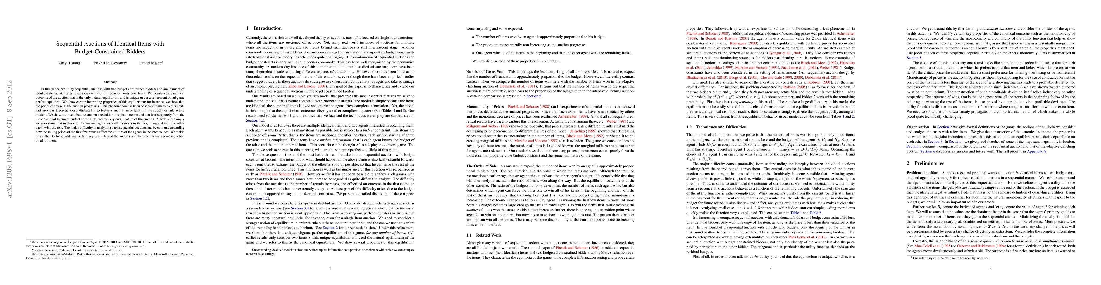 This paper analyzes sequential auctions with two budget-constrained bidders and identical items, finding that prices decrease as the auction progresses due to the sequential nature of the auction, not requiring uncertainty or risk aversion.