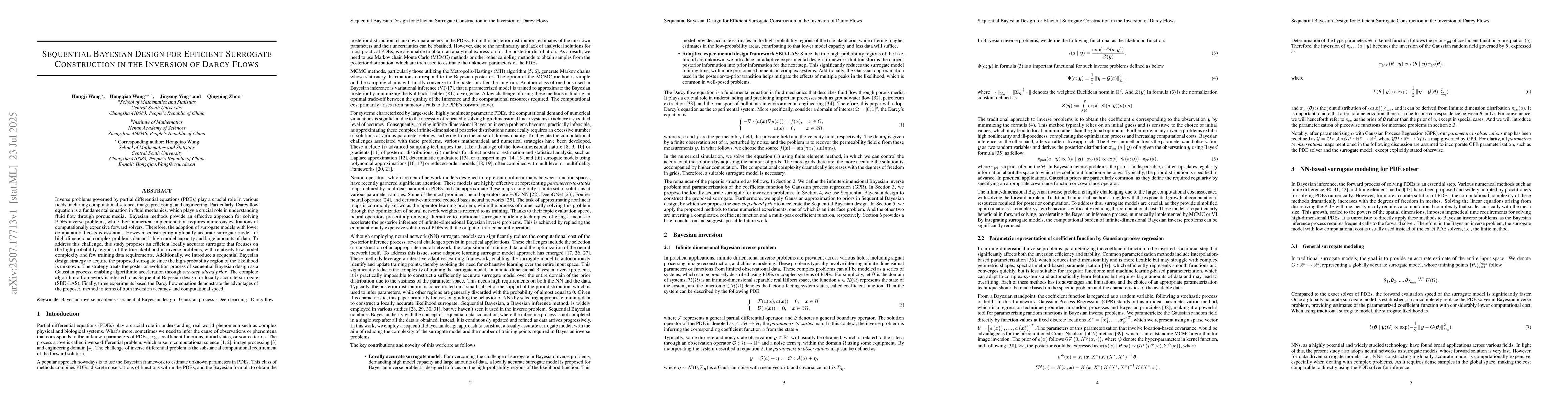 This research introduces Sequential Bayesian design for constructing efficient, locally accurate surrogate models to tackle computationally expensive inverse problems governed by the Darcy flow equation. The method, SBD-LAS, focuses on high-probability regions of the true likelihood, requiring less model complexity and training data. It employs a sequential Bayesian design strategy to identify these regions, demonstrating improved inversion accuracy and computational speed in Darcy flow experiments.