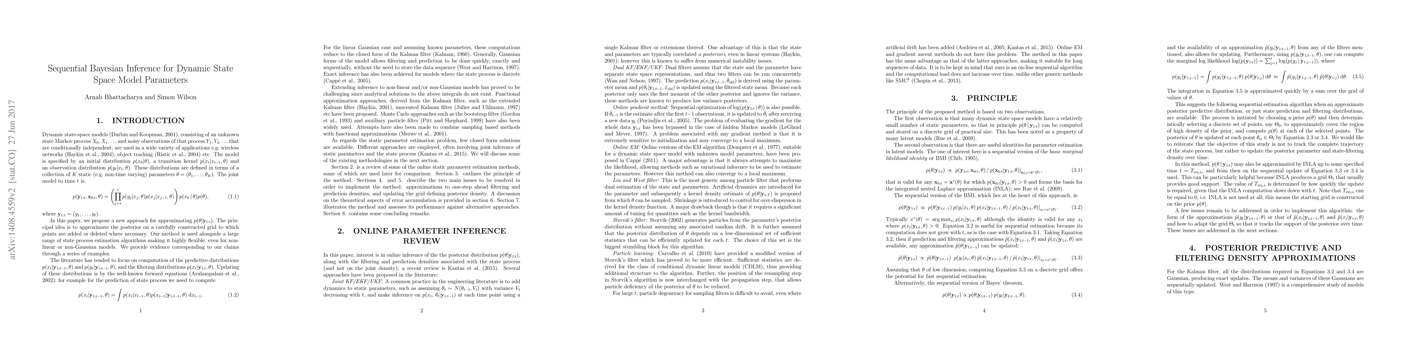 A method for sequential Bayesian inference of the static parameters of a dynamic state space model is proposed. The method is based on the observation that many dynamic state space models have a relatively small number of static parameters (or hyper-parameters), so that in principle the posterior can be computed and stored on a discrete grid of practical size which can be tracked dynamically. Further to this, this approach is able to use any existing methodology which computes the filtering and prediction distributions of the state process. Kalman filter and its extensions to non-linear/non-Gaussian situations have been used in this paper. This is illustrated using several applications: linear Gaussian model, Binomial model, stochastic volatility model and the extremely non-linear univariate non-stationary growth model. Performance has been compared to both existing on-line method and off-line methods.