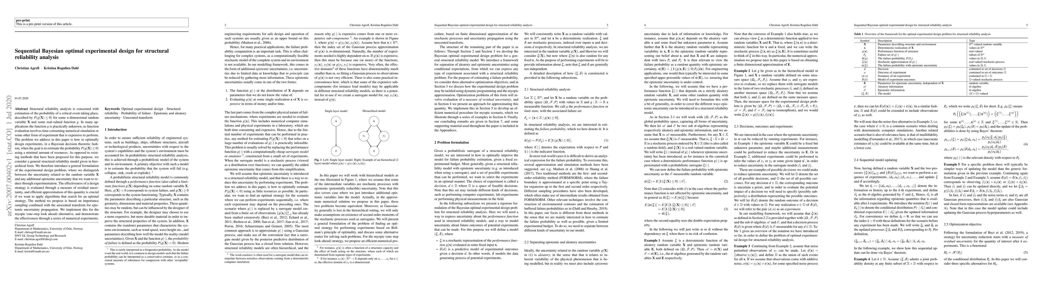 Structural reliability analysis is concerned with estimation of the probability of a critical event taking place, described by $P(g(\textbf{X}) \leq 0)$ for some $n$-dimensional random variable $\textbf{X}$ and some real-valued function $g$. In many applications the function $g$ is practically unknown, as function evaluation involves time consuming numerical simulation or some other form of experiment that is expensive to perform. The problem we address in this paper is how to optimally design experiments, in a Bayesian decision theoretic fashion, when the goal is to estimate the probability $P(g(\textbf{X}) \leq 0)$ using a minimal amount of resources. As opposed to existing methods that have been proposed for this purpose, we consider a general structural reliability model given in hierarchical form. We therefore introduce a general formulation of the experimental design problem, where we distinguish between the uncertainty related to the random variable $\textbf{X}$ and any additional epistemic uncertainty that we want to reduce through experimentation. The effectiveness of a design strategy is evaluated through a measure of residual uncertainty, and efficient approximation of this quantity is crucial if we want to apply algorithms that search for an optimal strategy. The method we propose is based on importance sampling combined with the unscented transform for epistemic uncertainty propagation. We implement this for the myopic (one-step look ahead) alternative, and demonstrate the effectiveness through a series of numerical experiments.