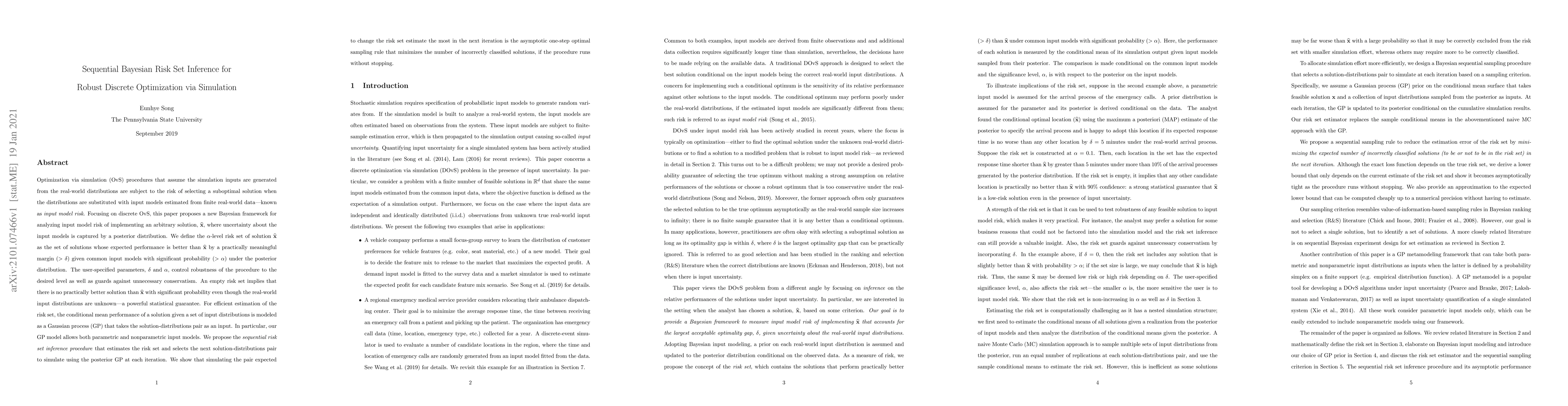 Optimization via simulation (OvS) procedures that assume the simulation inputs are generated from the real-world distributions are subject to the risk of selecting a suboptimal solution when the distributions are substituted with input models estimated from finite real-world data -- known as input model risk. Focusing on discrete OvS, this paper proposes a new Bayesian framework for analyzing input model risk of implementing an arbitrary solution, $x$, where uncertainty about the input models is captured by a posterior distribution. We define the $\alpha$-level risk set of solution $x$ as the set of solutions whose expected performance is better than $x$ by a practically meaningful margin $(>\delta)$ given common input models with significant probability ($>\alpha$) under the posterior distribution. The user-specified parameters, $\delta$ and $\alpha$, control robustness of the procedure to the desired level as well as guards against unnecessary conservatism. An empty risk set implies that there is no practically better solution than $x$ with significant probability even though the real-world input distributions are unknown. For efficient estimation of the risk set, the conditional mean performance of a solution given a set of input distributions is modeled as a Gaussian process (GP) that takes the solution-distributions pair as an input. In particular, our GP model allows both parametric and nonparametric input models. We propose the sequential risk set inference procedure that estimates the risk set and selects the next solution-distributions pair to simulate using the posterior GP at each iteration. We show that simulating the pair expected to change the risk set estimate the most in the next iteration is the asymptotic one-step optimal sampling rule that minimizes the number of incorrectly classified solutions, if the procedure runs without stopping.