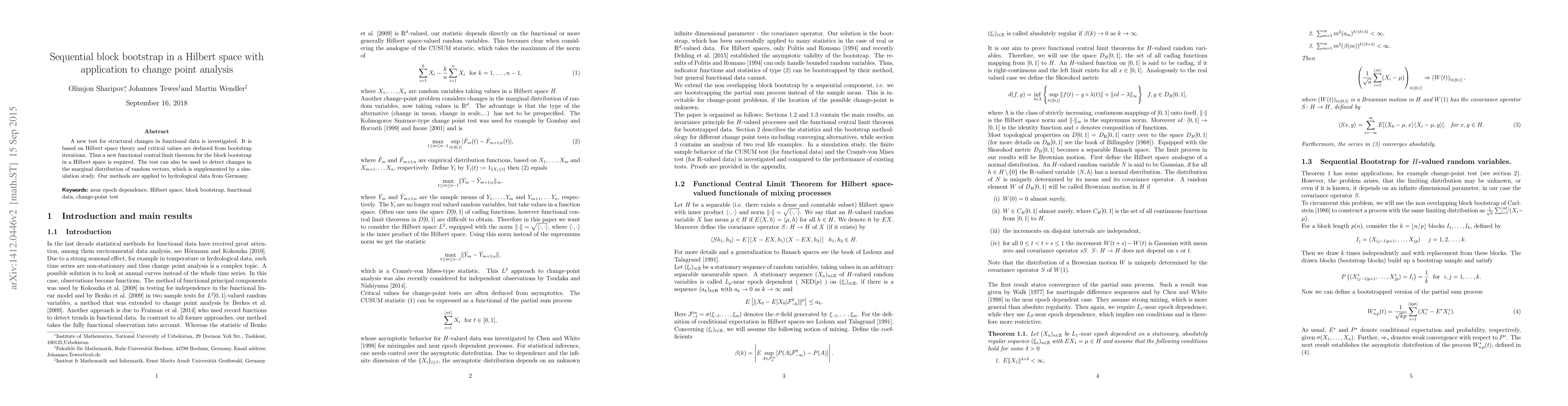 This paper proposes a new test for detecting structural changes in functional data using a sequential block bootstrap method in a Hilbert space. The test is validated through a simulation study and applied to hydrological data from Germany to identify change points.