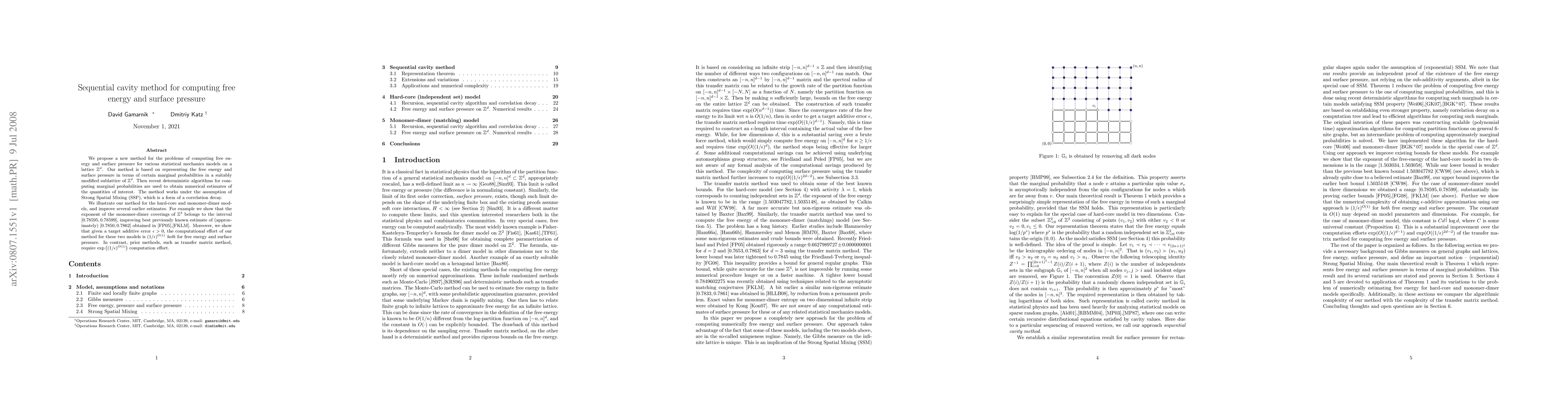 We propose a new method for the problems of computing free energy and surface pressure for various statistical mechanics models on a lattice $\Z^d$. Our method is based on representing the free energy and surface pressure in terms of certain marginal probabilities in a suitably modified sublattice of $\Z^d$. Then recent deterministic algorithms for computing marginal probabilities are used to obtain numerical estimates of the quantities of interest. The method works under the assumption of Strong Spatial Mixing (SSP), which is a form of a correlation decay. We illustrate our method for the hard-core and monomer-dimer models, and improve several earlier estimates. For example we show that the exponent of the monomer-dimer coverings of $\Z^3$ belongs to the interval $[0.78595,0.78599]$, improving best previously known estimate of (approximately) $[0.7850,0.7862]$ obtained in \cite{FriedlandPeled},\cite{FriedlandKropLundowMarkstrom}. Moreover, we show that given a target additive error $\epsilon>0$, the computational effort of our method for these two models is $(1/\epsilon)^{O(1)}$ \emph{both} for free energy and surface pressure. In contrast, prior methods, such as transfer matrix method, require $\exp\big((1/\epsilon)^{O(1)}\big)$ computation effort.