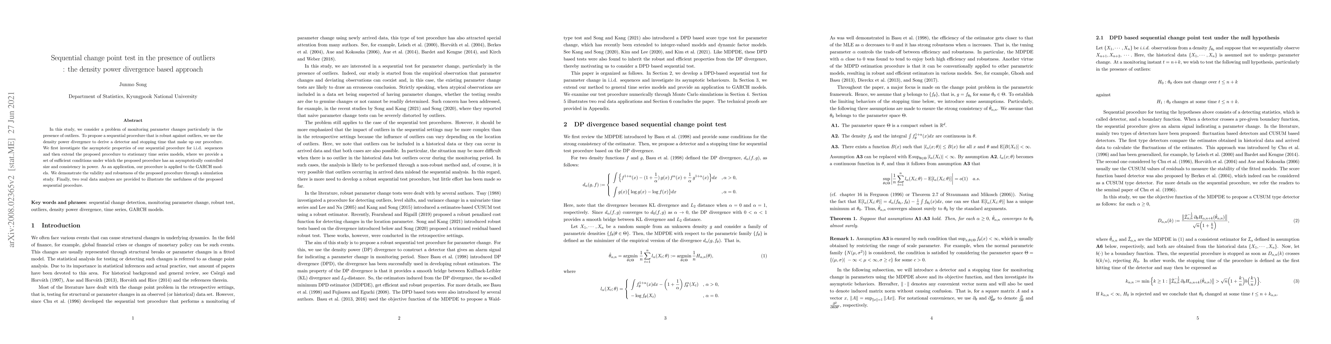 This paper proposes a robust sequential change point detection method using density power divergence, designed to handle outliers effectively. The method is validated through simulations and applied to GARCH models, demonstrating its validity and robustness in real data analyses.