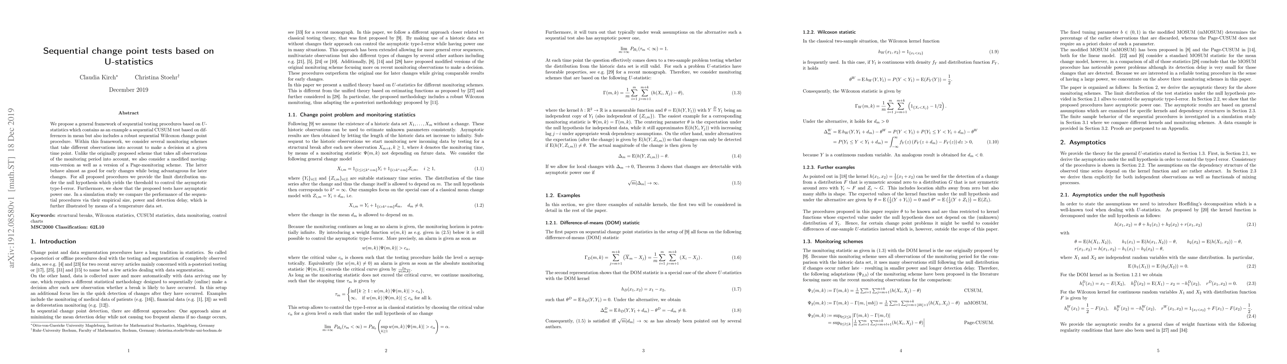 This paper proposes a general framework for sequential testing based on $U$-statistics, including a robust Wilcoxon change point procedure. It introduces modified monitoring schemes for early and later change detection, provides limit distributions to control error rates, and demonstrates asymptotic power one through simulations and a real-world temperature dataset.