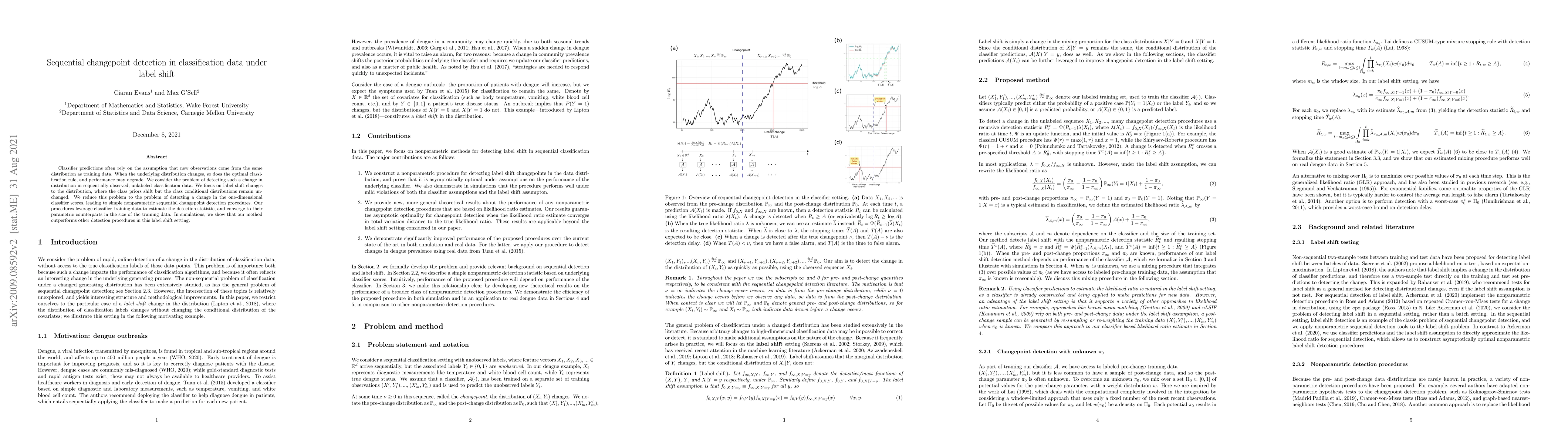 This paper proposes methods for detecting changes in the distribution of sequentially observed, unlabeled classification data due to label shift, where the class priors change but the class conditional distributions remain constant. The authors develop nonparametric sequential changepoint detection procedures based on classifier scores, which outperform other methods in simulations.