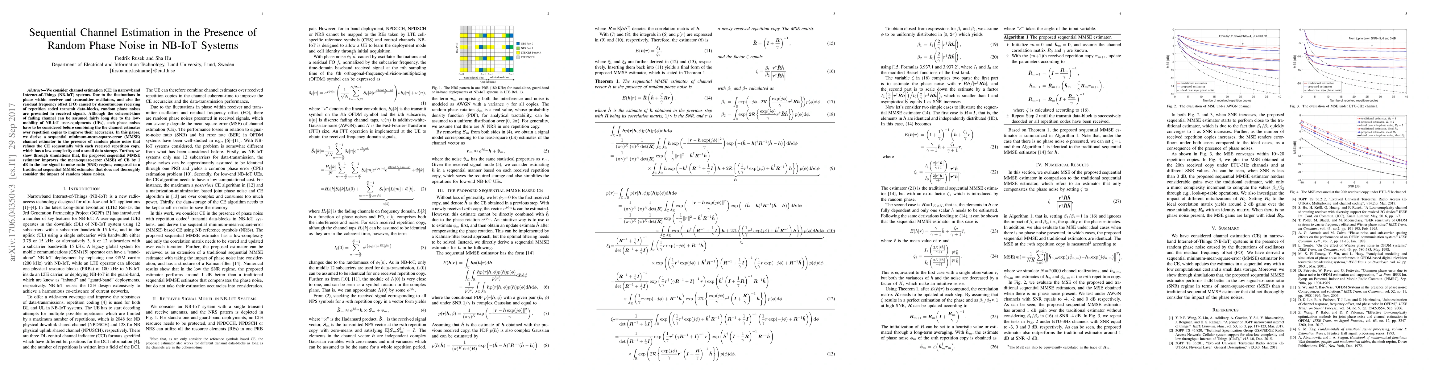 This research paper proposes a sequential channel estimator for NB-IoT systems that accounts for random phase noise, improving accuracy by 1 dB in low SNR regimes.
