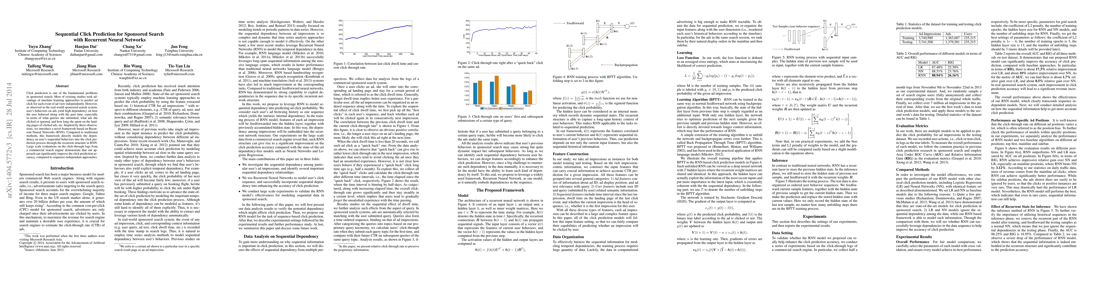 This paper proposes a Recurrent Neural Network (RNN) framework for sequential click prediction in sponsored search, which models the dependency on user behaviors over time. Evaluations show significant improvements in click prediction accuracy compared to traditional, sequence-independent methods.