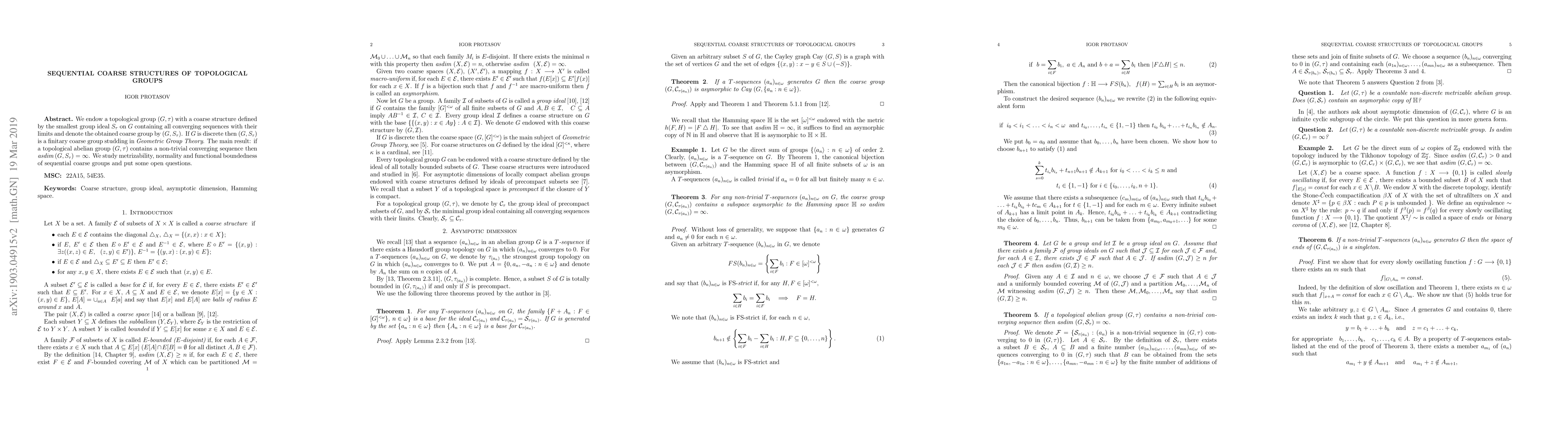We endow a topological group $(G, \tau)$ with a coarse structure defined by the smallest group ideal $S_{\tau} $ on $G$ containing all converging sequences with their limits and denote the obtained coarse group by $(G, S_{\tau})$. If $G$ is discrete then $(G, S_{\tau})$ is a finitary coarse group studding in Geometric Group Theory. The main result: if a topological abelian group $(G, \tau)$ contains a non-trivial converging sequence then $asdim \ (G, S_{\tau})= \infty $.