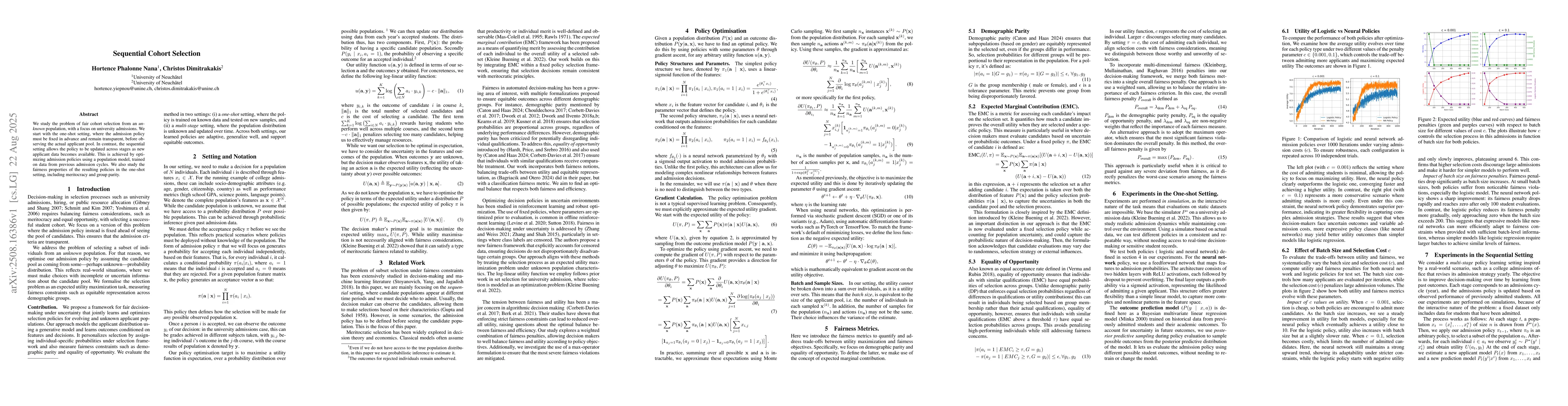 We study the problem of fair cohort selection from an unknown population, with a focus on university admissions. We start with the one-shot setting, where the admission policy must be fixed in advance and remain transparent, before observing the actual applicant pool. In contrast, the sequential setting allows the policy to be updated across stages as new applicant data becomes available. This is achieved by optimizing admission policies using a population model, trained on data from previous admission cycles. We also study the fairness properties of the resulting policies in the one-shot setting, including meritocracy and group parity.