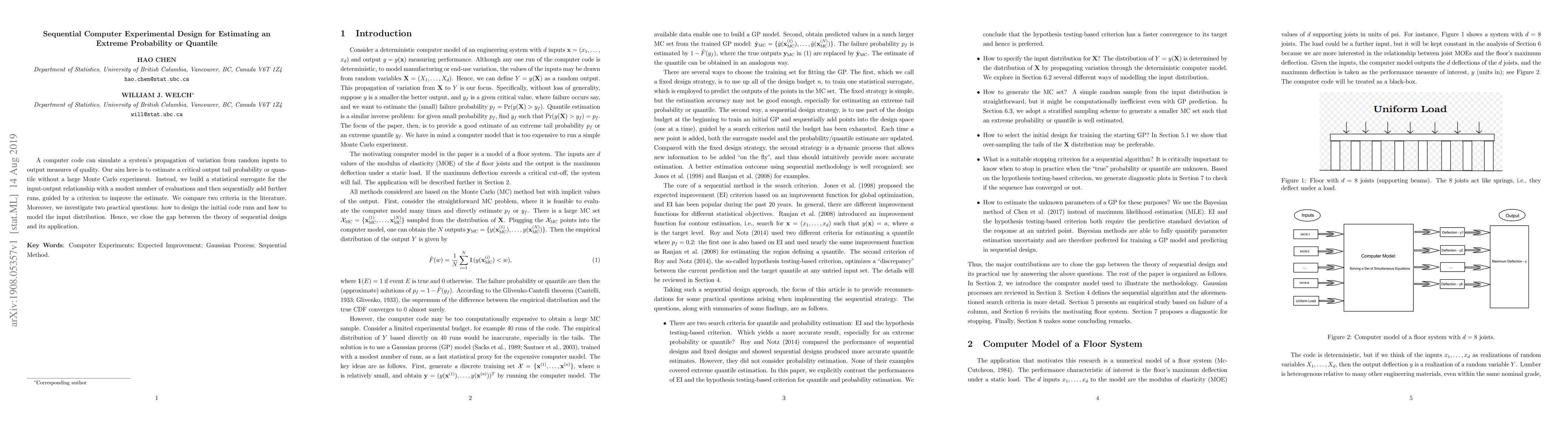 A computer code can simulate a system's propagation of variation from random inputs to output measures of quality. Our aim here is to estimate a critical output tail probability or quantile without a large Monte Carlo experiment. Instead, we build a statistical surrogate for the input-output relationship with a modest number of evaluations and then sequentially add further runs, guided by a criterion to improve the estimate. We compare two criteria in the literature. Moreover, we investigate two practical questions: how to design the initial code runs and how to model the input distribution. Hence, we close the gap between the theory of sequential design and its application.