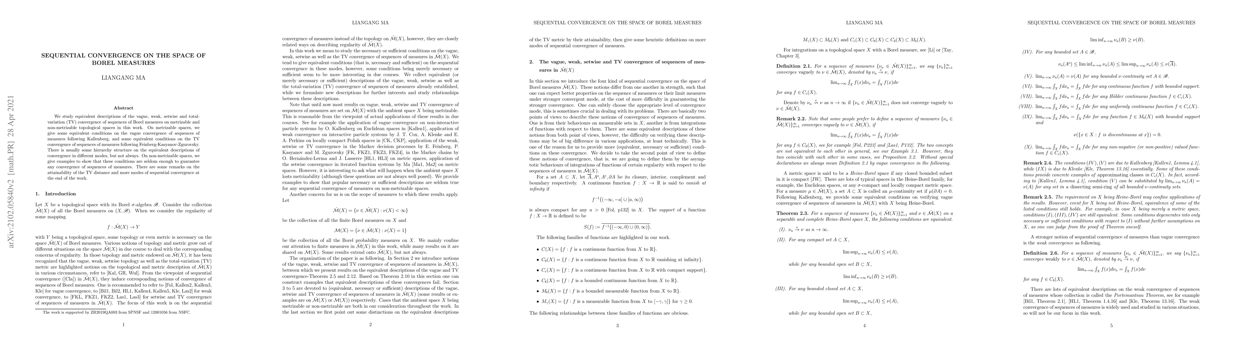 We study equivalent descriptions of the vague, weak, setwise and total-variation (TV) convergence of sequences of Borel measures on metrizable and non-metrizable topological spaces in this work. On metrizable spaces, we give some equivalent conditions on the vague convergence of sequences of measures following Kallenberg, and some equivalent conditions on the TV convergence of sequences of measures following Feinberg-Kasyanov-Zgurovsky. There is usually some hierarchy structure on the equivalent descriptions of convergence in different modes, but not always. On non-metrizable spaces, we give examples to show that these conditions are seldom enough to guarantee any convergence of sequences of measures. There are some remarks on the attainability of the TV distance and more modes of sequential convergence at the end of the work.