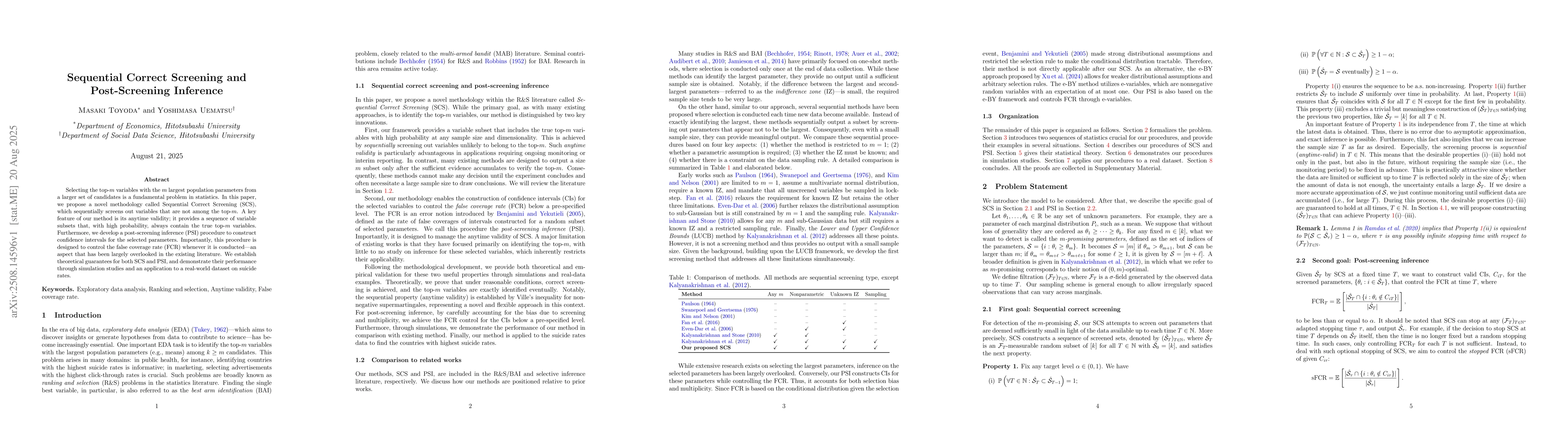 The paper proposes Sequential Correct Screening (SCS) for selecting the top-$m$ variables and Post-Screening Inference (PSI) for constructing confidence intervals, ensuring anytime validity and false coverage rate control.