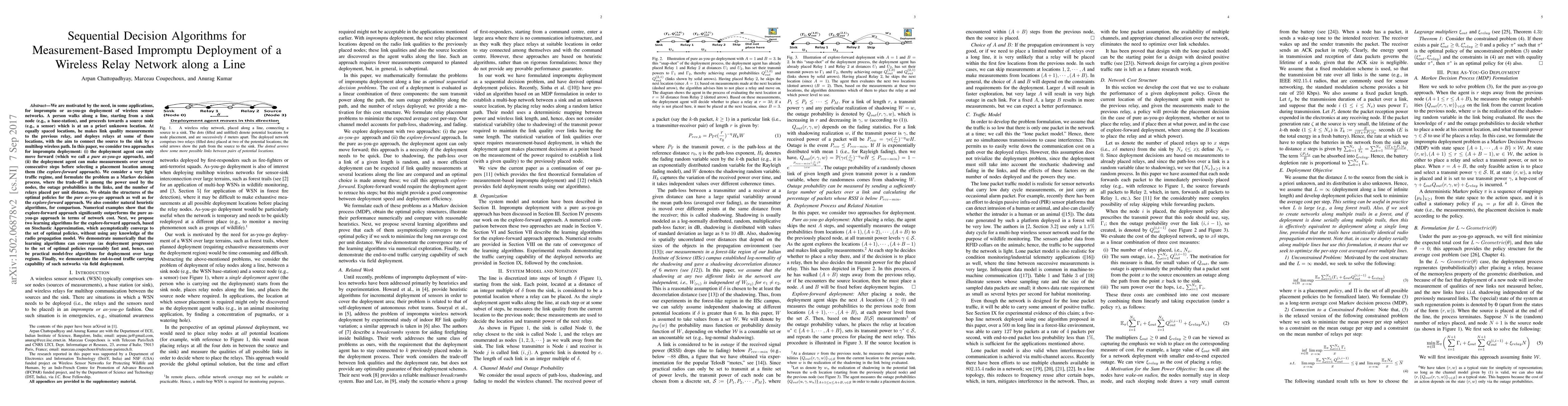 This paper explores algorithms for deploying wireless relays along a line in an impromptu fashion, comparing two approaches: a pure as-you-go method and an explore-forward method. The explore-forward approach, which allows measurements over several steps before relay placement, outperforms the pure method. The paper also proposes learning algorithms based on Stochastic Approximation that converge to optimal policies without requiring knowledge of the propagation model.