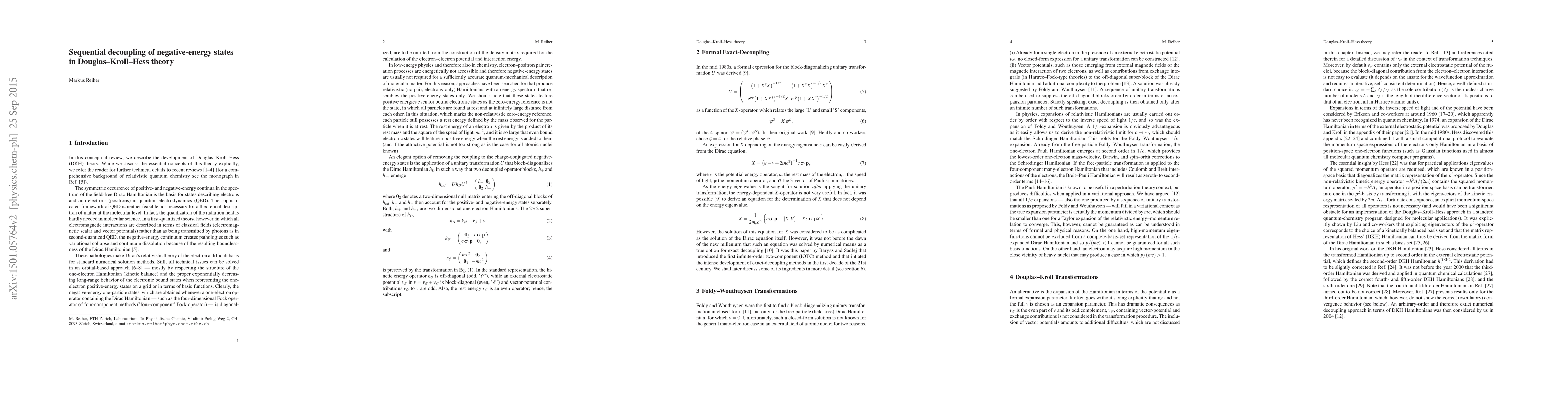 Here, we review the historical development, current status, and prospects of Douglas--Kroll--Hess theory as a quantum chemical relativistic electrons-only theory.