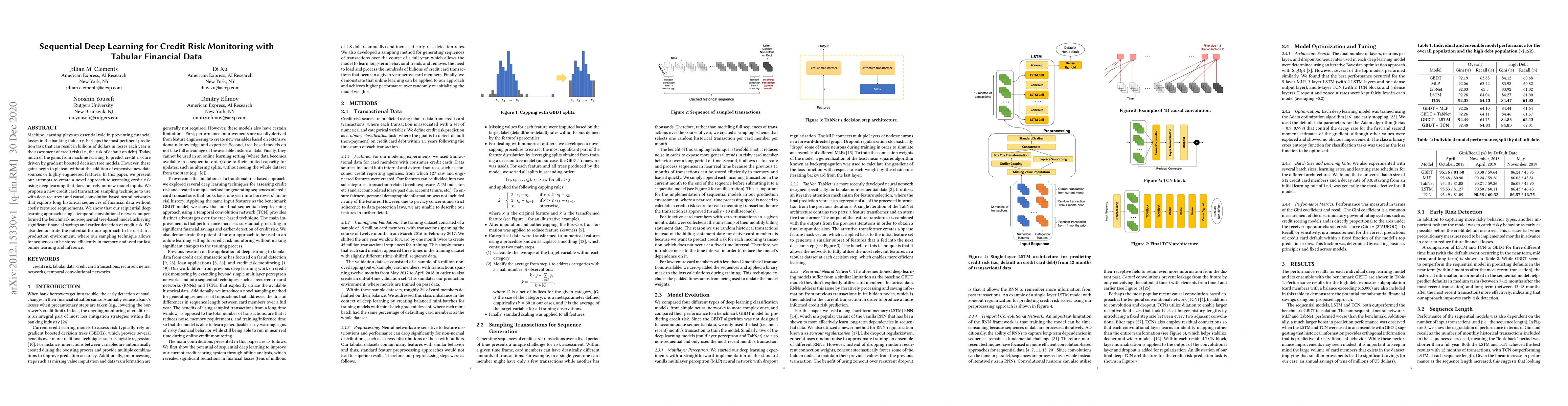 Machine learning plays an essential role in preventing financial losses in the banking industry. Perhaps the most pertinent prediction task that can result in billions of dollars in losses each year is the assessment of credit risk (i.e., the risk of default on debt). Today, much of the gains from machine learning to predict credit risk are driven by gradient boosted decision tree models. However, these gains begin to plateau without the addition of expensive new data sources or highly engineered features. In this paper, we present our attempts to create a novel approach to assessing credit risk using deep learning that does not rely on new model inputs. We propose a new credit card transaction sampling technique to use with deep recurrent and causal convolution-based neural networks that exploits long historical sequences of financial data without costly resource requirements. We show that our sequential deep learning approach using a temporal convolutional network outperformed the benchmark non-sequential tree-based model, achieving significant financial savings and earlier detection of credit risk. We also demonstrate the potential for our approach to be used in a production environment, where our sampling technique allows for sequences to be stored efficiently in memory and used for fast online learning and inference.