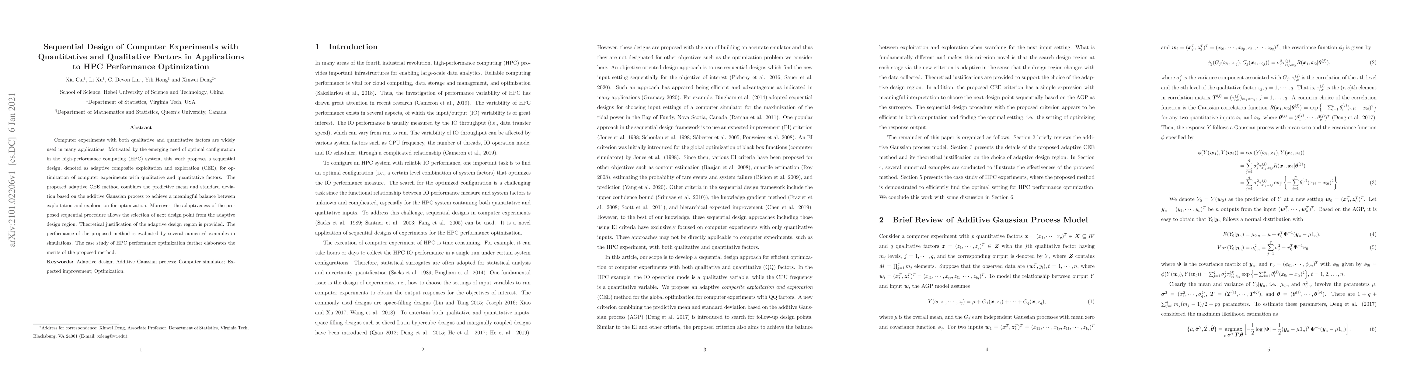 This paper proposes a sequential design method called adaptive composite exploitation and exploration (CEE) for optimizing computer experiments with both qualitative and quantitative factors, particularly in high-performance computing (HPC) systems. The CEE method balances exploitation and exploration using predictive mean and standard deviation from additive Gaussian processes, and its adaptiveness allows for selecting the next design point from an adaptive design region.