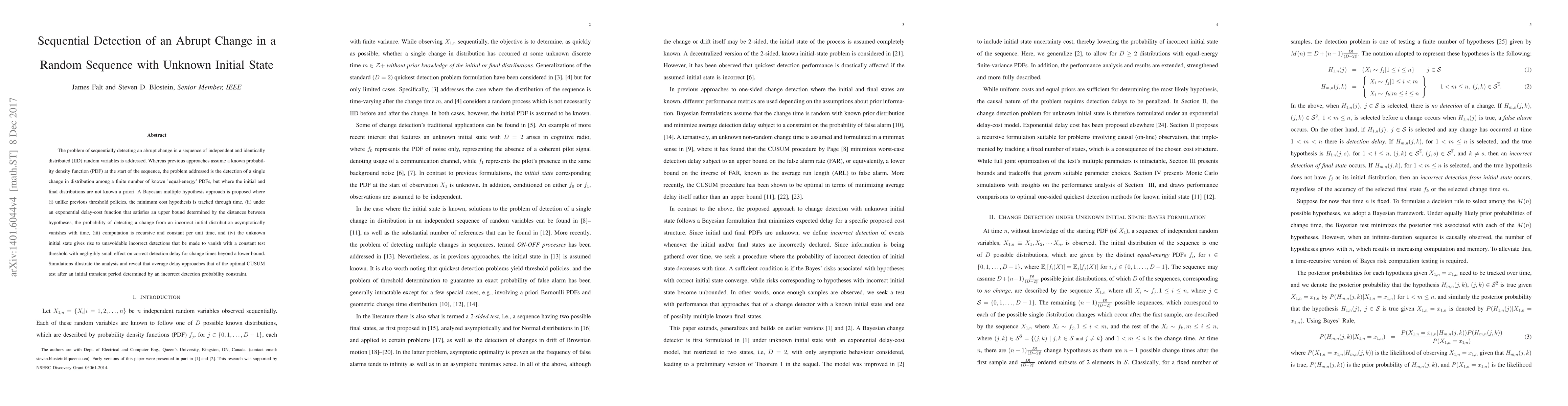 Researchers propose a Bayesian approach to detecting abrupt changes in random sequences with unknown initial states, achieving average delay comparable to optimal CUSUM tests after an initial transient period.