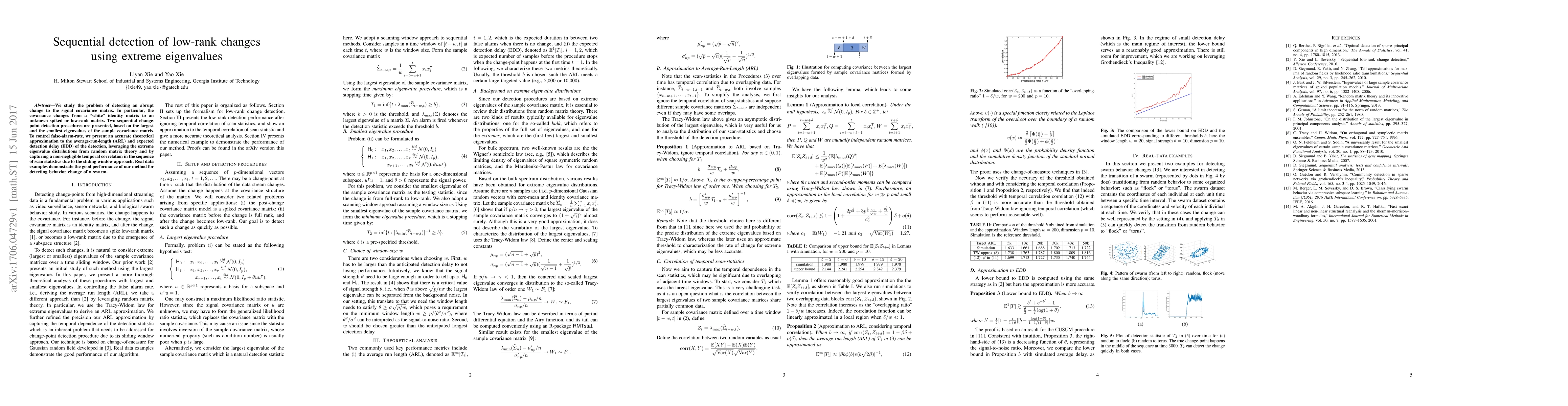 This paper proposes two sequential change-point detection methods for identifying abrupt shifts in signal covariance from an identity matrix to a low-rank matrix, using the largest and smallest eigenvalues of the sample covariance matrix. It leverages extreme eigenvalue distributions and random matrix theory to accurately approximate the average-run-length and expected detection delay, demonstrating effective performance on real data for detecting swarm behavior changes.