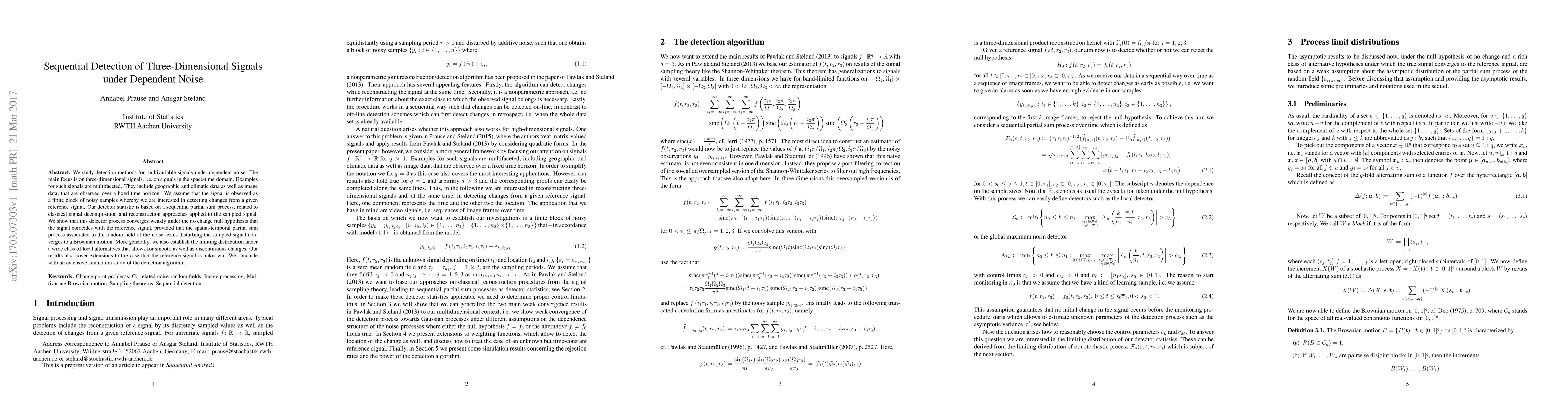 This research paper develops a detection method for three-dimensional signals under dependent noise, demonstrating convergence to a Brownian motion under the null hypothesis and establishing a limiting distribution for local alternatives.