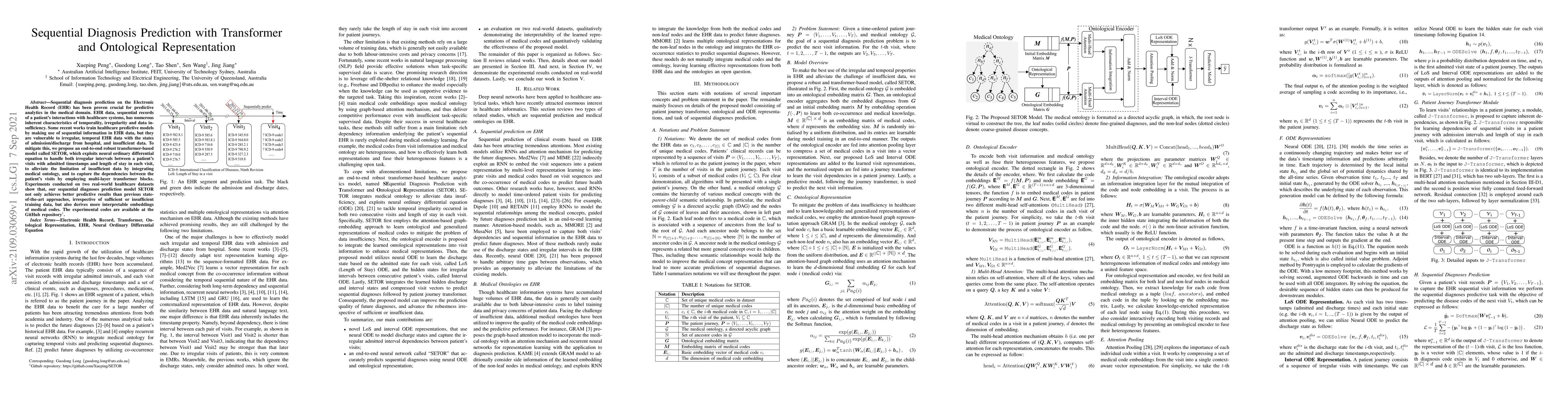 This paper proposes SETOR, a transformer-based model that uses neural ordinary differential equations to handle irregular intervals in EHR data and integrates medical ontology to address data insufficiency. Experiments demonstrate SETOR's superior performance in sequential diagnosis prediction compared to existing methods.