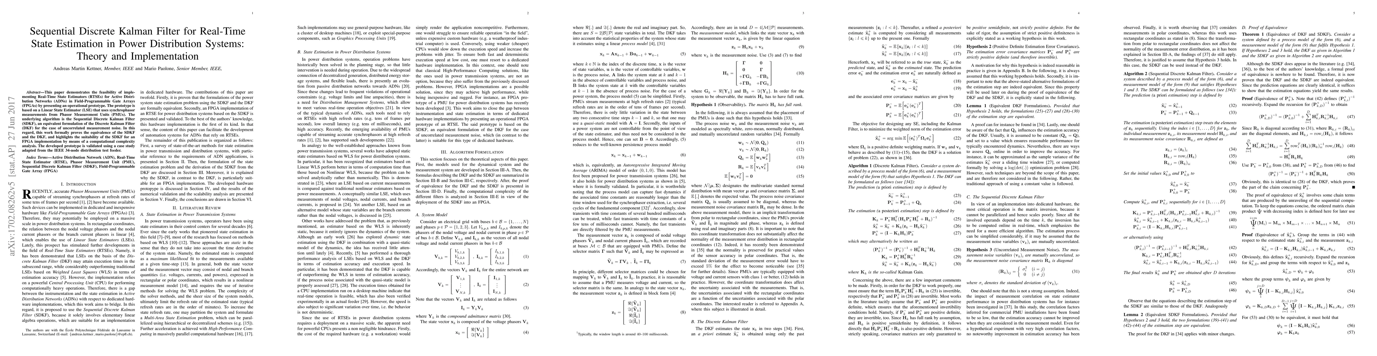 This paper presents a Sequential Discrete Kalman Filter for real-time state estimation in power distribution systems, demonstrating its feasibility for Field-Programmable Gate Array implementation.