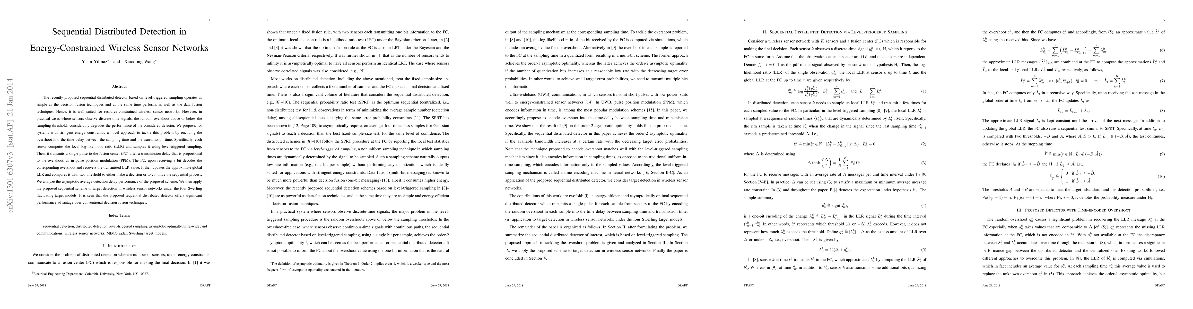 This paper proposes a novel sequential distributed detection method for energy-constrained wireless sensor networks that encodes overshoot into transmission delay to improve performance. The method uses level-triggered sampling and pulse position modulation to transmit local log-likelihood ratios, enabling the fusion center to decode overshoot and recover transmitted values, ultimately offering significant performance advantages over conventional decision fusion techniques.