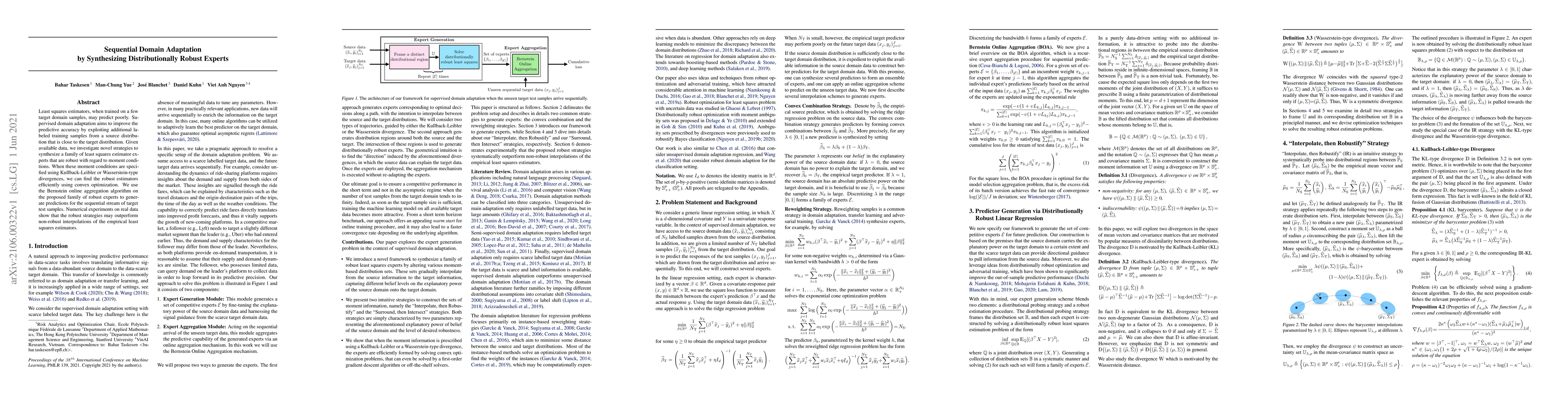 Least squares estimators, when trained on a few target domain samples, may predict poorly. Supervised domain adaptation aims to improve the predictive accuracy by exploiting additional labeled training samples from a source distribution that is close to the target distribution. Given available data, we investigate novel strategies to synthesize a family of least squares estimator experts that are robust with regard to moment conditions. When these moment conditions are specified using Kullback-Leibler or Wasserstein-type divergences, we can find the robust estimators efficiently using convex optimization. We use the Bernstein online aggregation algorithm on the proposed family of robust experts to generate predictions for the sequential stream of target test samples. Numerical experiments on real data show that the robust strategies may outperform non-robust interpolations of the empirical least squares estimators.