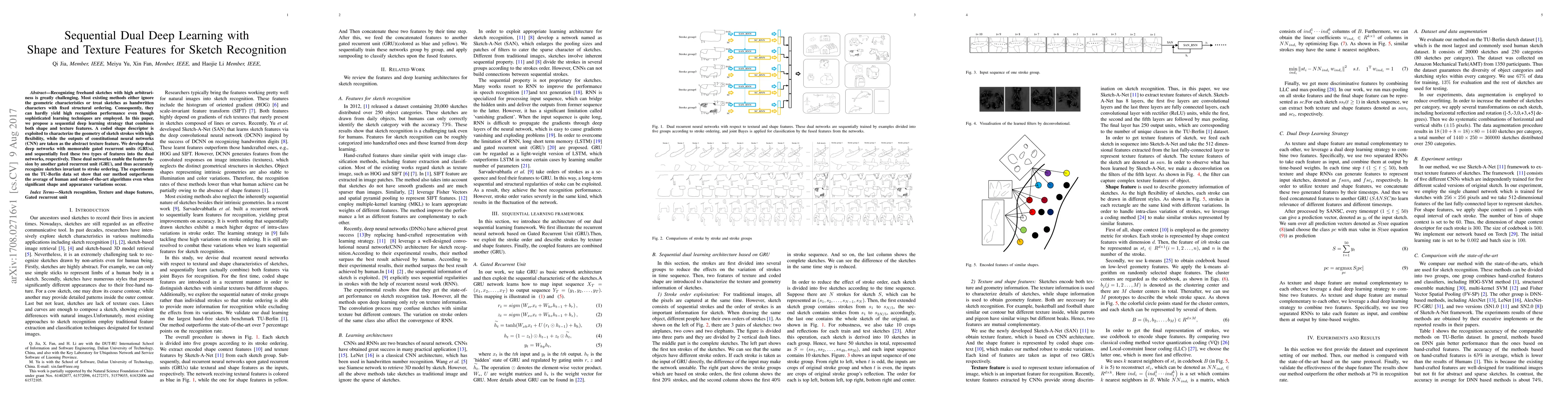 This paper proposes a sequential dual deep learning approach combining shape and texture features for sketch recognition, using coded shape descriptors and convolutional neural networks to capture both geometric and textural characteristics. The method employs dual deep networks with gated recurrent units for feature fusion, achieving superior recognition performance even with significant variations.