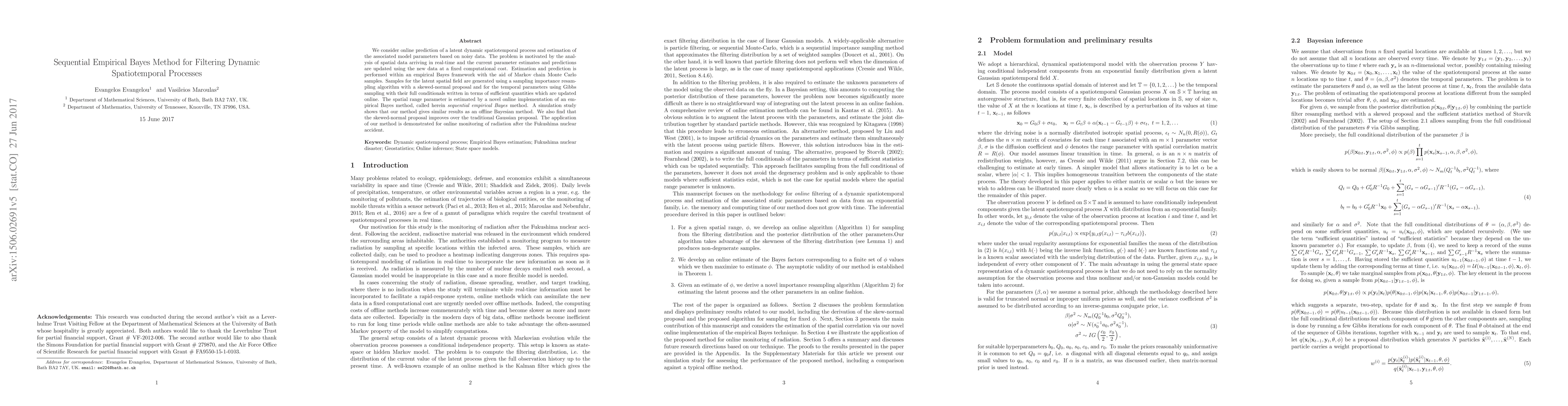 This paper proposes a sequential empirical Bayes method for online prediction and estimation of dynamic spatiotemporal processes using real-time data. The method employs Markov chain Monte Carlo samples and an online implementation of empirical Bayes for parameter estimation, showing improved performance with a skewed-normal proposal over traditional Gaussian methods.