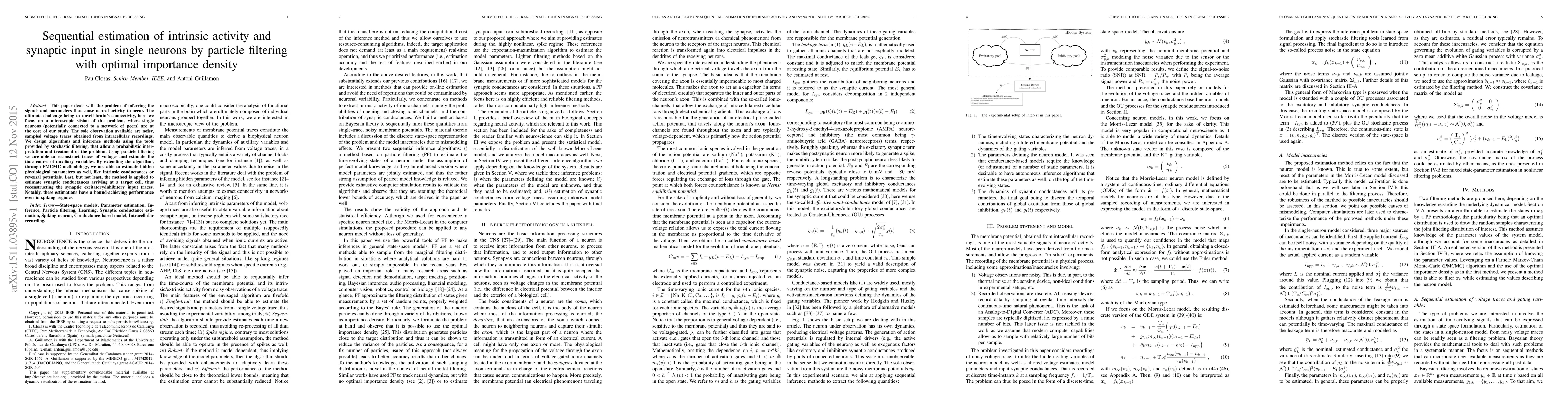 This paper deals with the problem of inferring the signals and parameters that cause neural activity to occur. The ultimate challenge being to unveil brain's connectivity, here we focus on a microscopic vision of the problem, where single neurons (potentially connected to a network of peers) are at the core of our study. The sole observation available are noisy, sampled voltage traces obtained from intracellular recordings. We design algorithms and inference methods using the tools provided by stochastic filtering, that allow a probabilistic interpretation and treatment of the problem. Using particle filtering we are able to reconstruct traces of voltages and estimate the time course of auxiliary variables. By extending the algorithm, through PMCMC methodology, we are able to estimate hidden physiological parameters as well, like intrinsic conductances or reversal potentials. Last, but not least, the method is applied to estimate synaptic conductances arriving at a target cell, thus reconstructing the synaptic excitatory/inhibitory input traces. Notably, these estimations have a bound-achieving performance even in spiking regimes.
