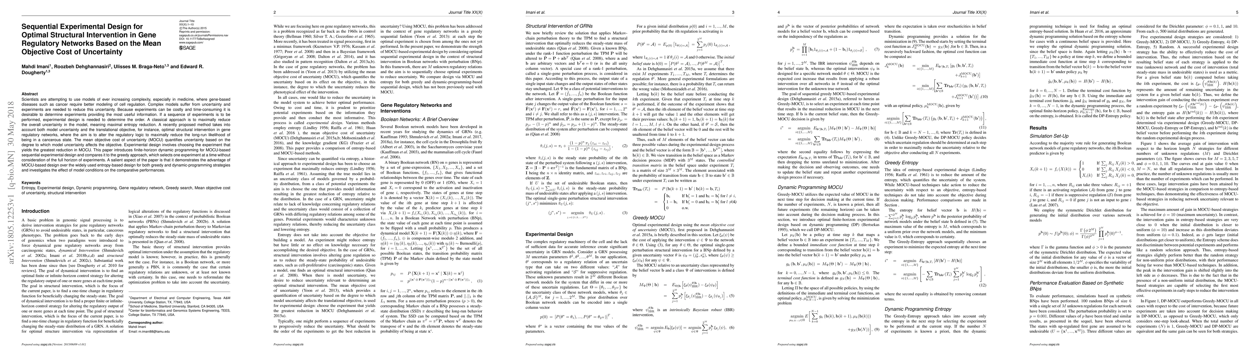 This paper proposes a sequential experimental design method based on the mean objective cost of uncertainty (MOCU) for optimizing structural interventions in gene regulatory networks. It introduces finite-horizon dynamic programming for MOCU-based design and demonstrates its advantages over entropy-based design, showing better performance in reducing model uncertainty and achieving desired regulatory outcomes.