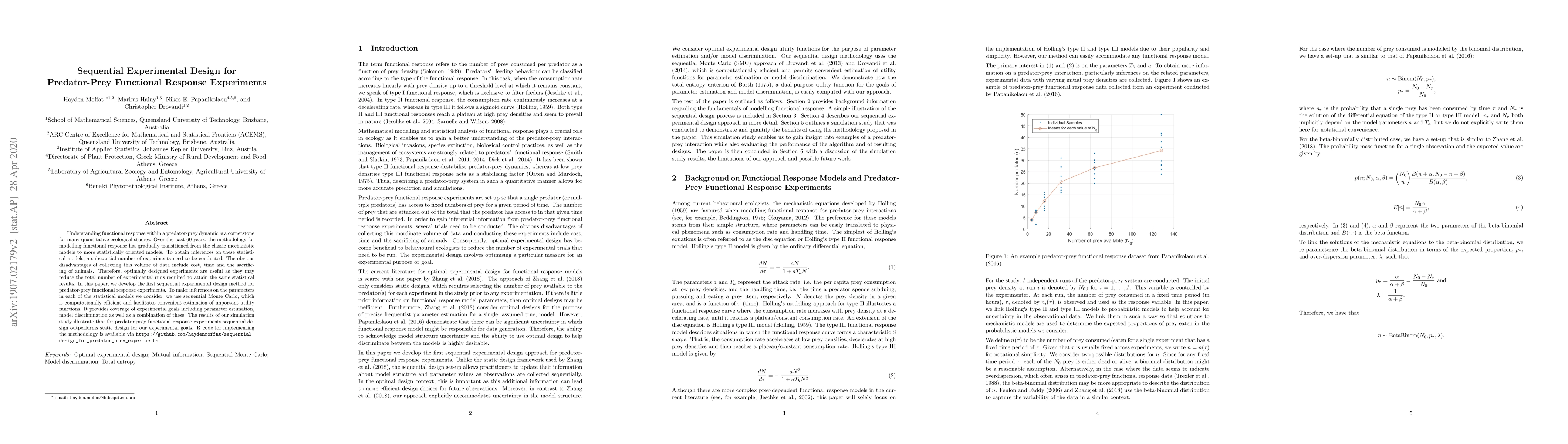 This paper introduces a novel sequential experimental design method for predator-prey functional response experiments, utilizing sequential Monte Carlo for efficient parameter estimation and model discrimination. Simulation results show that this approach outperforms traditional static designs, reducing the number of experimental runs required while achieving the same statistical outcomes.