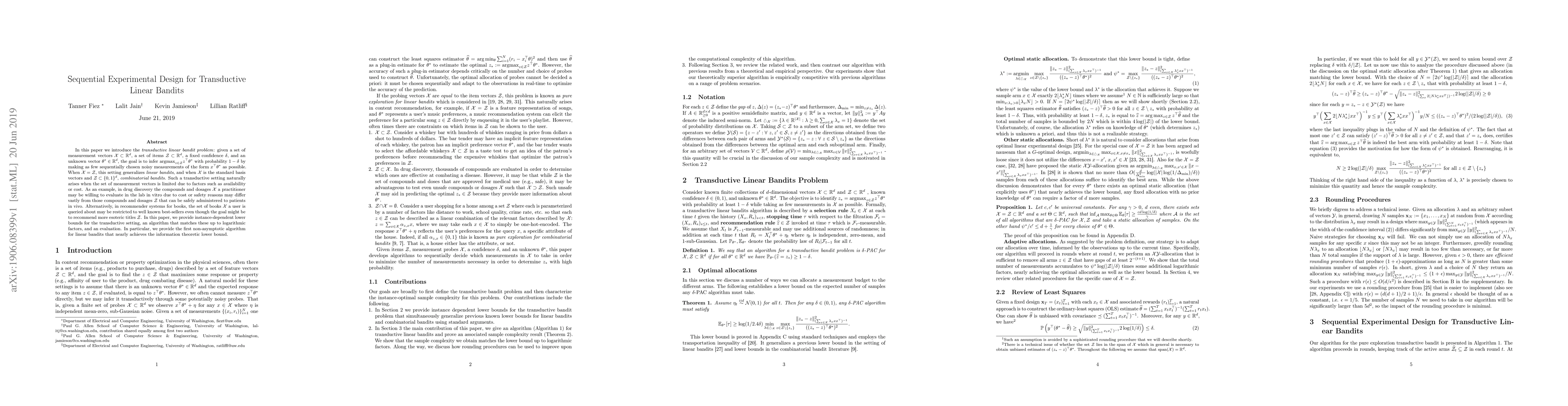 In this paper we introduce the transductive linear bandit problem: given a set of measurement vectors $\mathcal{X}\subset \mathbb{R}^d$, a set of items $\mathcal{Z}\subset \mathbb{R}^d$, a fixed confidence $\delta$, and an unknown vector $\theta^{\ast}\in \mathbb{R}^d$, the goal is to infer $\text{argmax}_{z\in \mathcal{Z}} z^\top\theta^\ast$ with probability $1-\delta$ by making as few sequentially chosen noisy measurements of the form $x^\top\theta^{\ast}$ as possible. When $\mathcal{X}=\mathcal{Z}$, this setting generalizes linear bandits, and when $\mathcal{X}$ is the standard basis vectors and $\mathcal{Z}\subset \{0,1\}^d$, combinatorial bandits. Such a transductive setting naturally arises when the set of measurement vectors is limited due to factors such as availability or cost. As an example, in drug discovery the compounds and dosages $\mathcal{X}$ a practitioner may be willing to evaluate in the lab in vitro due to cost or safety reasons may differ vastly from those compounds and dosages $\mathcal{Z}$ that can be safely administered to patients in vivo. Alternatively, in recommender systems for books, the set of books $\mathcal{X}$ a user is queried about may be restricted to well known best-sellers even though the goal might be to recommend more esoteric titles $\mathcal{Z}$. In this paper, we provide instance-dependent lower bounds for the transductive setting, an algorithm that matches these up to logarithmic factors, and an evaluation. In particular, we provide the first non-asymptotic algorithm for linear bandits that nearly achieves the information theoretic lower bound.